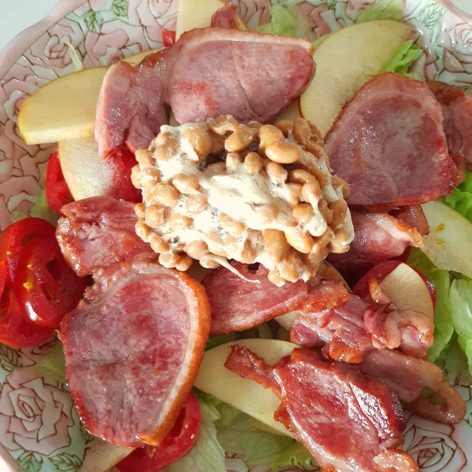#오리배 샐러드 먹을 때부터 느꼈던 건데 낫또와 훈제오리의 궁합이 참 절묘하게 어울린다. 훈제오리의 짭짤함과 낫또의 나토키나제, 콩의 식감이 아주 잘 어울린다. 그리고 여기에 사과나 배와 같은 단 맛이 있다면 더 베스트! 이제부터 낫또와 훈제오리+단 맛 조합은 믿먹 조합이다. 아, 방울토마토와 양상추와도 생각보다 잘 어울렸다. 간단하고 쉽게 구할 수 있는 재료인데 맛도 괜찮다. 낫 배드! 낫또 입문자한테 추천할 만한 조합이다.