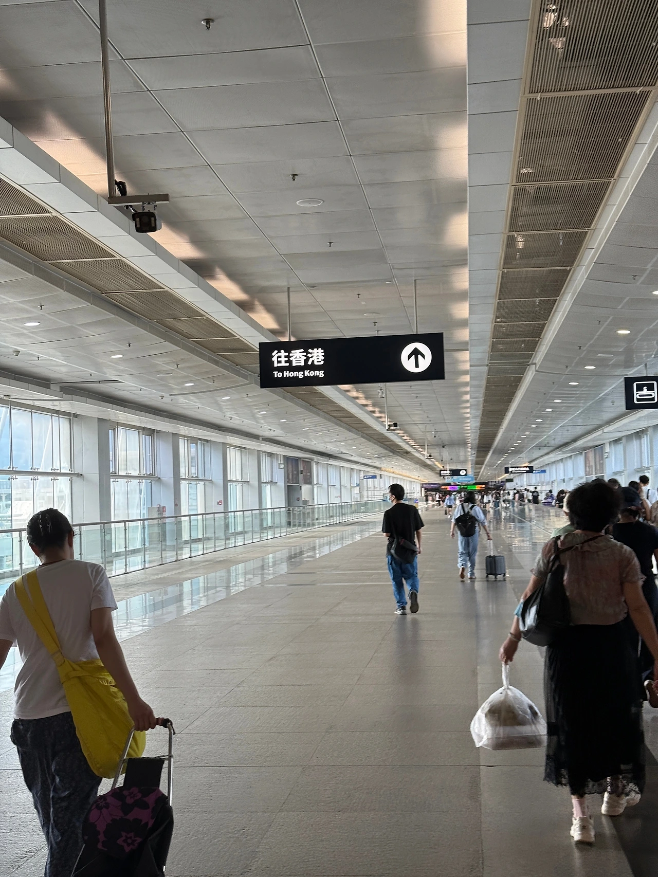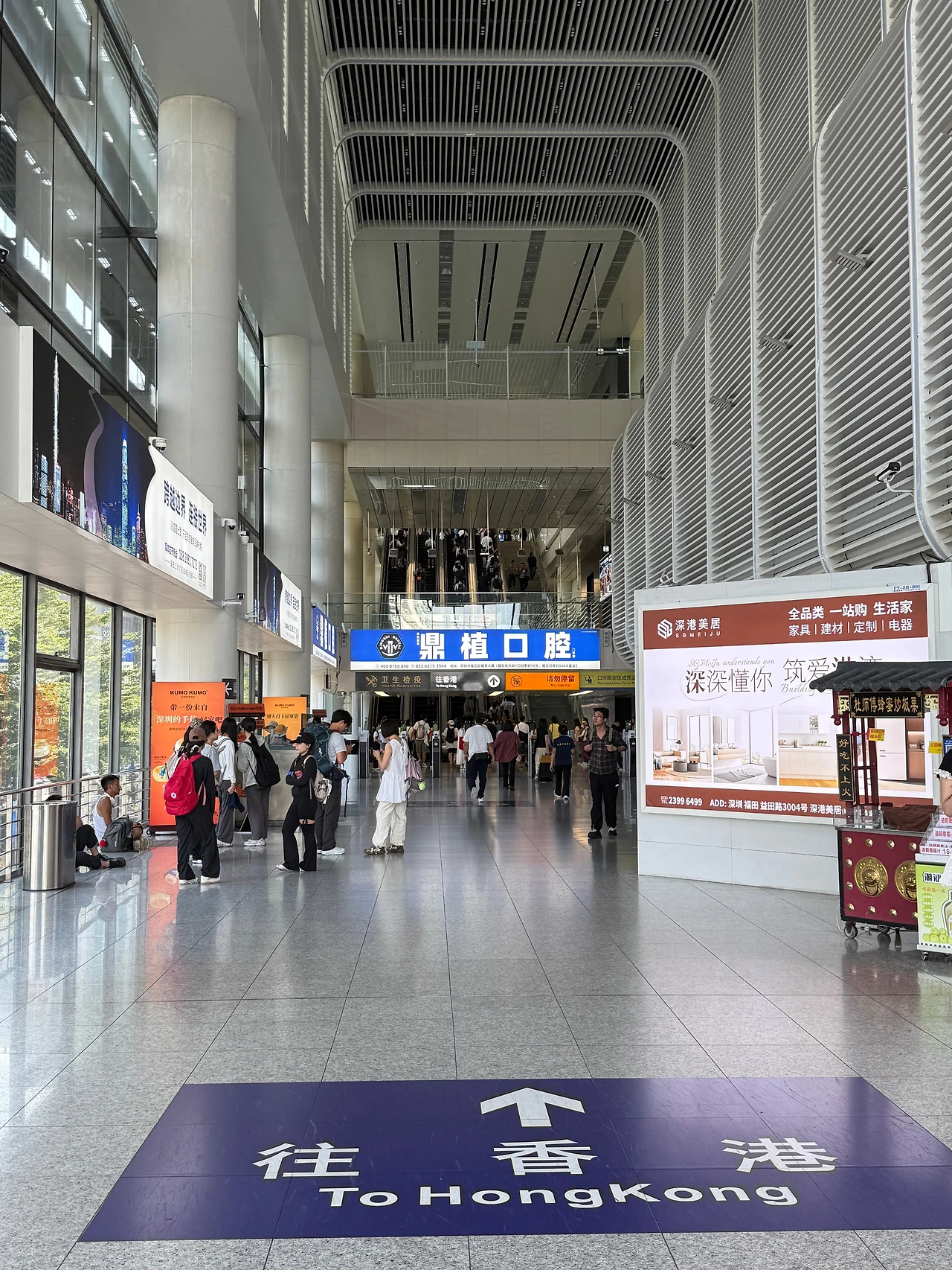 입국장에 들어서면 바닥에 큼지막하게 ‘홍콩으로’ 가는 방향이 표시돼 있다. 입국장 구조는 층층이 나뉘어 있고 전체 규모는 서울역보다 조금 작은 정도다. 출국 심사대는 열댓 개 이상 배치되어 있어 줄이 빠르게 줄었고 한국 여권이라고 특별히 오래 붙잡히진 않았다. 주변을 둘러보니 대부분은 홍콩으로 주말 나들이를 하러 넘어가는 중국 본토 여행객들이었다.