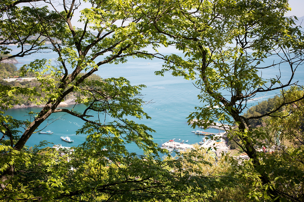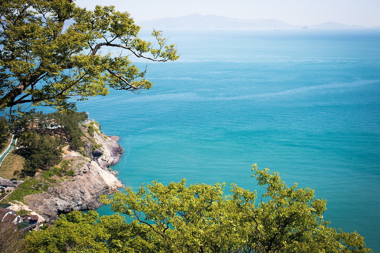 숨이 가빠올수록 바다색은 선명해지고 포구는 점점 더 멀어진다. 푸른 나뭇잎 사이로 보이는 바다의 또 다른 푸르름이 상쾌하다. 하늘과 나무의 푸르름을 섞으면 저 바다의 푸르름이 만들어질까? 저 멀리 보이는 수평선은 하늘과 섞여 구분이 어렵다. 이제 조금만 더 올라가면 향일암이다.