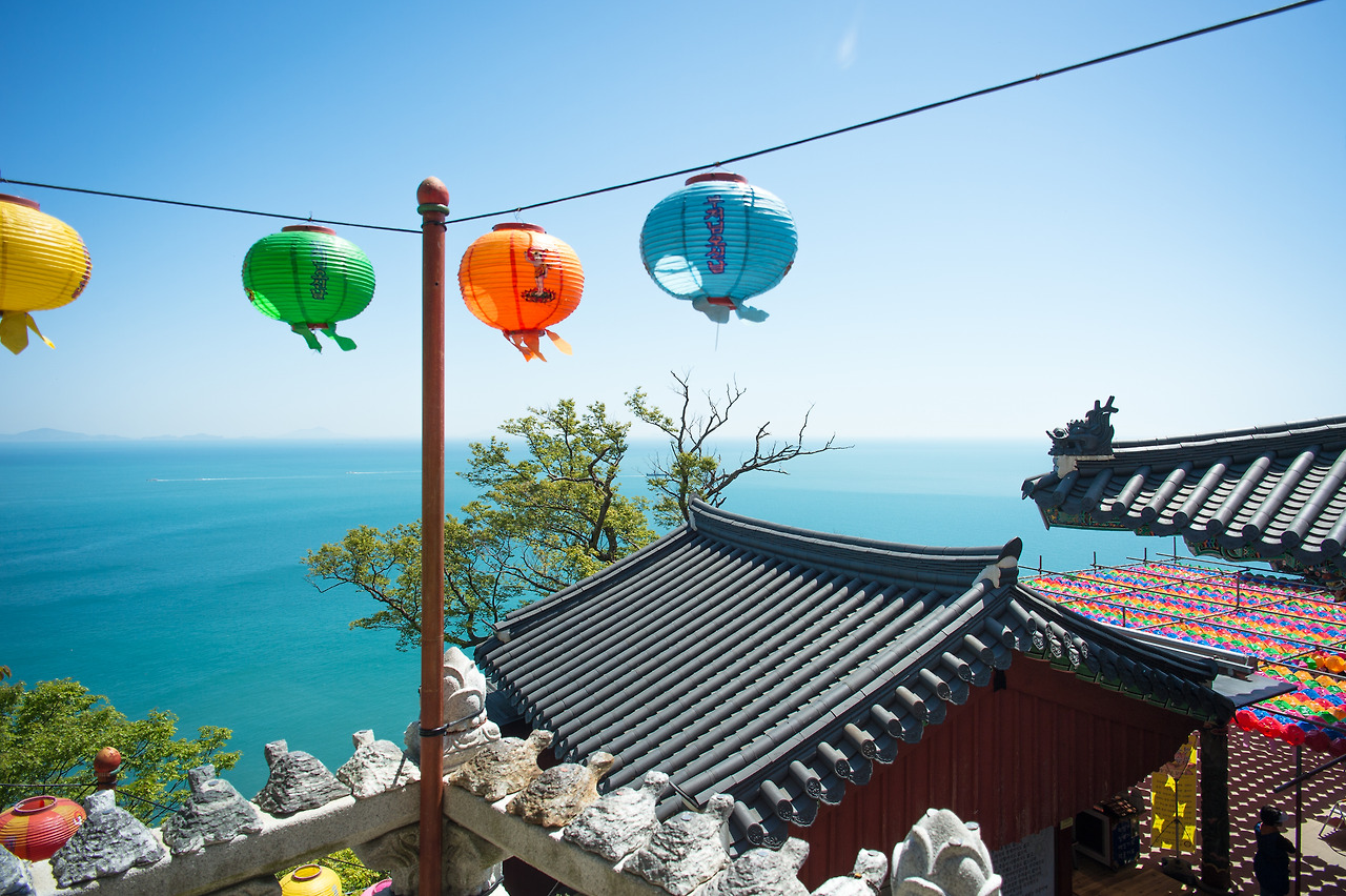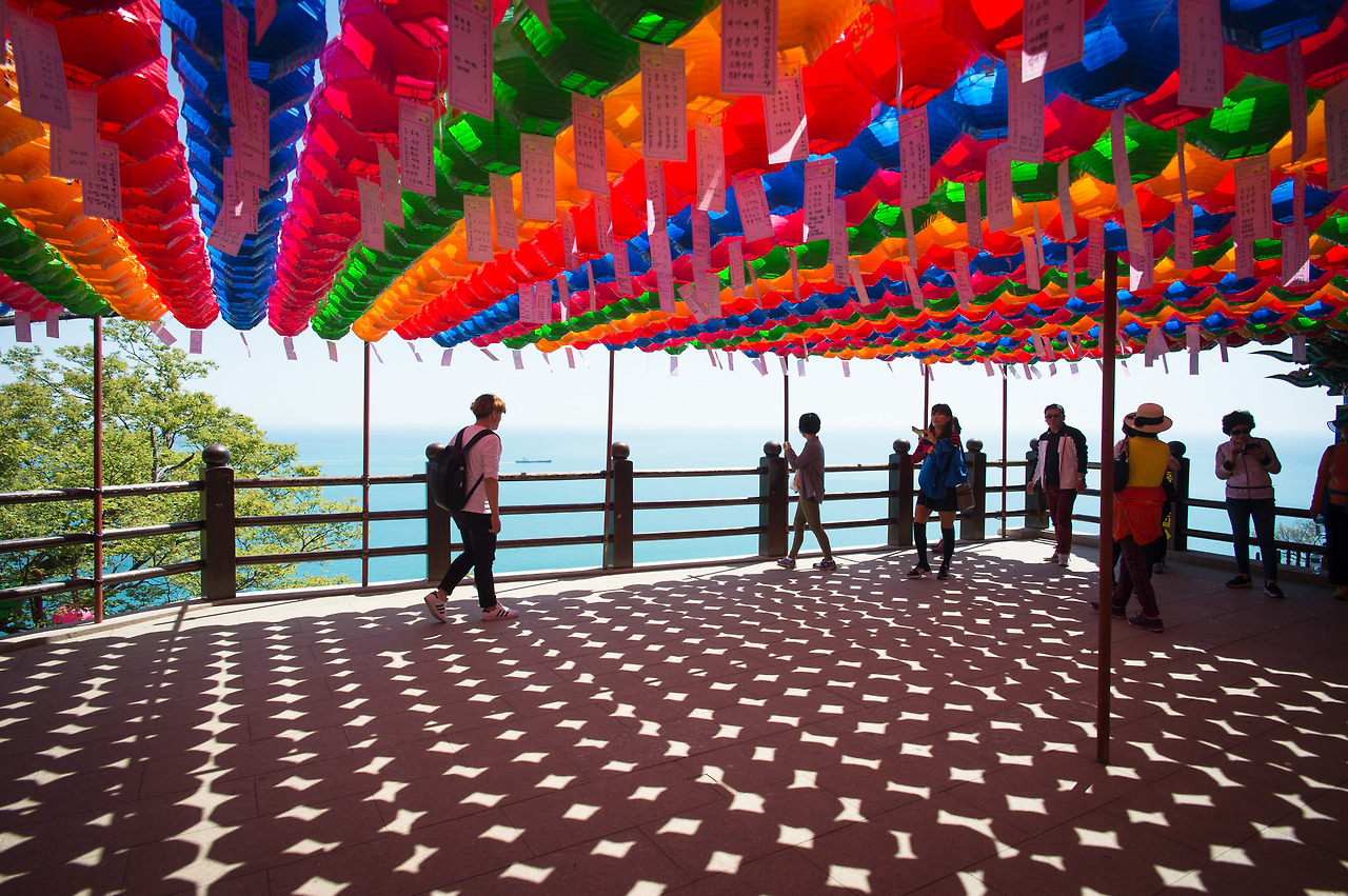 향일암은 신라시대에 만들어졌다고 하는데 2009년 12월 화재로 대웅전 등 큰 손실을 입었다고 한다. 지금은 화재의 흔적은 전혀 찾아볼 수 없다. 화창한 날씨 덕에 향일암에서 바라보는 남해 바다는 참으로 아름답다. 바다 너머로 보이는 다도해의 실루엣은 육지임에도 하늘과 바다와 닮은 색을 띠고 있다. 여기에 절에서 꾸며 놓은 형형색색의 종이 등이 화려함을 더한다. 관광객들이 입고 온 원색의 등산복조차도 화려한 색감 속에 스며들어 버린다.