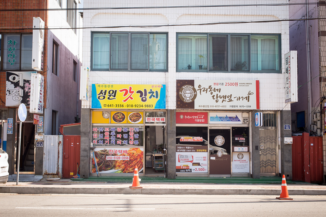 이 곳이 여수임을 상징하는 표식들은 도시 곳곳에 자리 잡고 있다. 대표적인 표식은 바로 갓김치. 알싸하면서 쌉싸름한 돌산 갓김치의 맛은 여수를 대표하는 맛이다. 그 옆에 있는 '담뱃잎 가게'는 좀 생소하다. 찾아보니 완성품 담배가 부담스러운 사람들을 위해 '담뱃잎'만 팔고 담배를 말고 필터를 붙이고 하는 작업은 손님이 해야 하는 방식이라고. 서울에도 있다던데 여수에서 훨씬 자주 마주치는 듯하다.