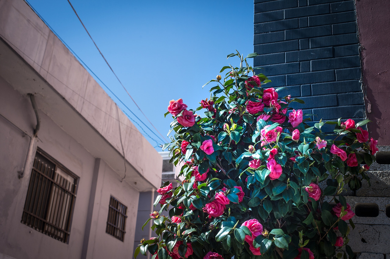 애초에는 오동도를 먼저 가 볼 생각이었다. 숙소 근처 버스 정류장에서 이야기를 나누게 된 어르신께서 뜬금없이 향일암을 먼저 가 보는 게 나을 것이라고 하셨고, 애초 별 계획 없이 쏘다니는 나는 바로 향일암으로 행선지를 바꿨다. 향일암으로 가는 버스는 20분 후에나 도착할 예정이다. 버스 정류장 근처는 평범한 주택가였고 야트막한 슬라브 집들이 어린 시절 우리 동네를 떠올리게 한다. 여수임을 상기시켜 주는 동백꽃이 늦게까지 남아서 피어 있다.