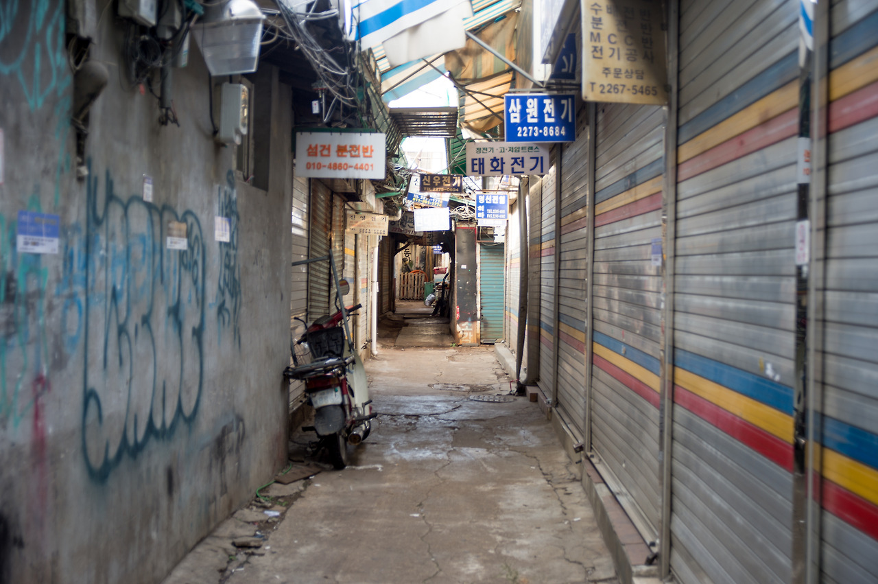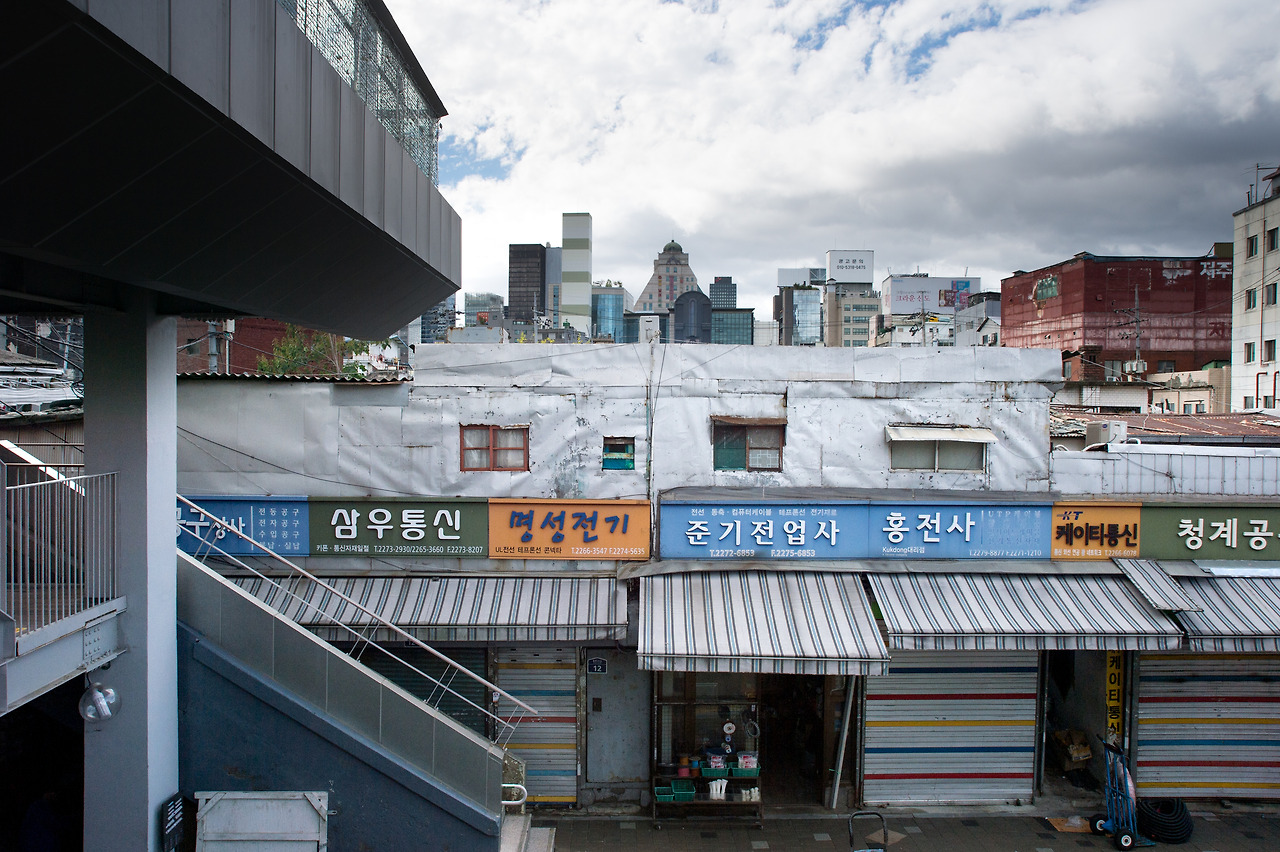 세운상가 양 옆으로 을지로 공구상가, 전자상가가 자리하고 있습니다. 서울의 옛 모습을 그대로 간직하고 있는 좁은 골목으로 이어져 있지요. 눈비를 피하려고 올려놓은 지붕들이 아주 재미난 색감을 만들어 냅니다. 이 곳도 어쩌면 조만간 재개발될 것 같네요. 도시재생이라는 개념으로 우아하게 접근하기에는 너무나 이해관계들이 복잡하고 첨예하겠지요. 그렇더라도 이런 곳이 서울의 매력인데 말이죠, 조선 500년과 일제 강점기, 그리고 6.25 이후의 경제 성장기를 이어주는 소중한 도시의 흔적들인데 말입니다.