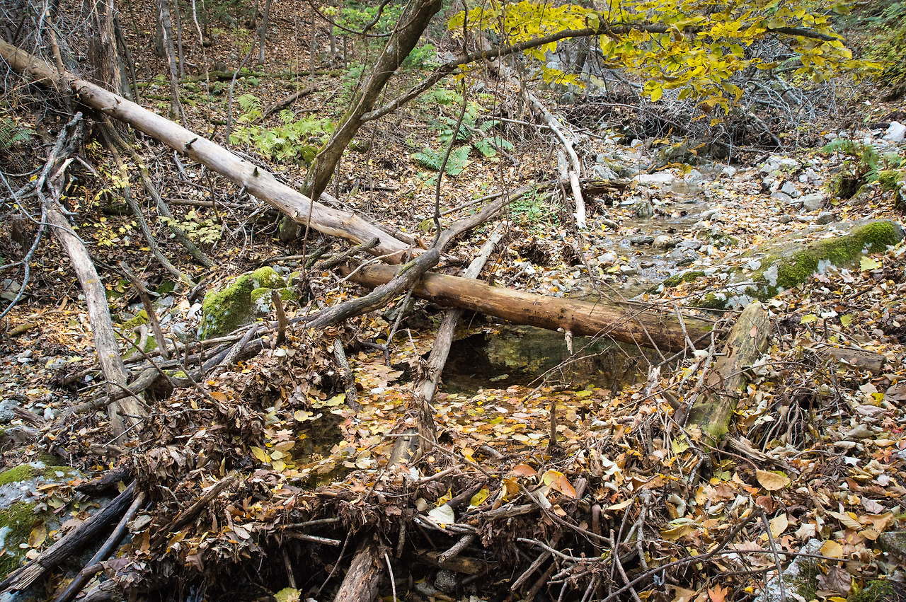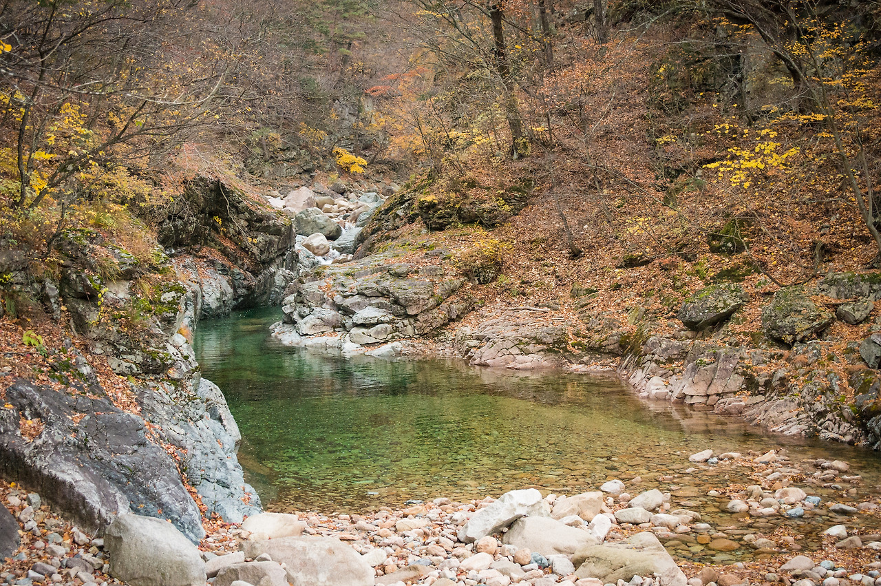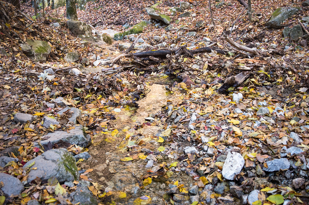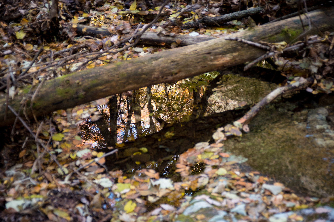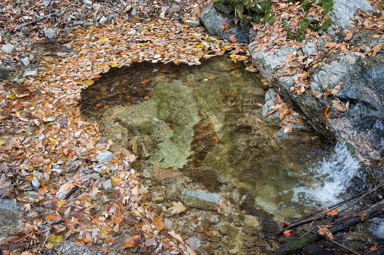 아직 등산객이 오기에는 이른 시간이었는지 산길은 고즈넉하니 물소리만 들려온다. 넓지 않은 계곡엔 나무가 쓰러져 있고, 쓰러진 나무 등걸에 잔가지들이 엉켜 자그마한 연못을 이룬다. 연못 가장자리로 떠 있는 낙엽들과 투명하게 고인 계곡물은 시리도록 눈부시다. 성큼성큼 산을 오르는 친구의 눈치를 보아가며 셔터를 누른다. 좁은 계곡이지만 야생 그대로의 자연이 아름답다.