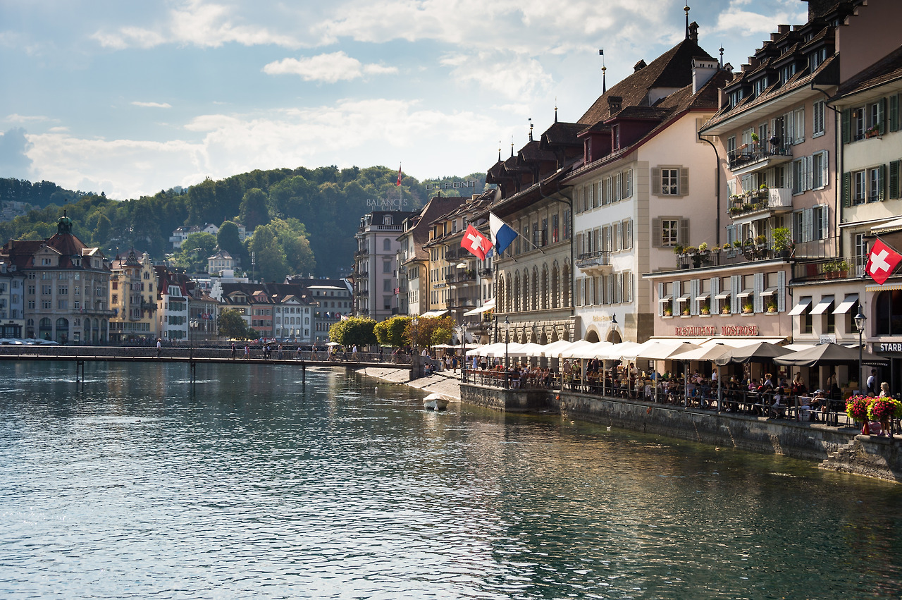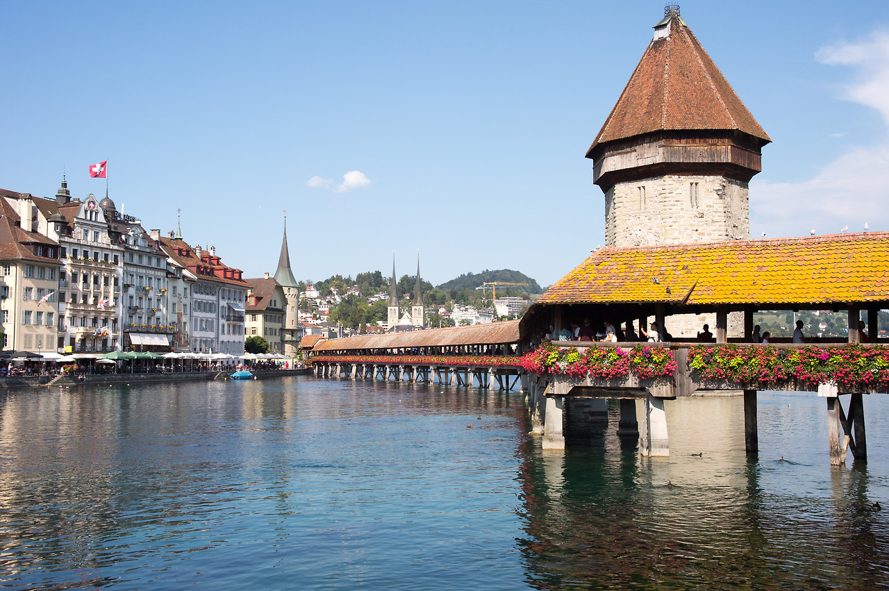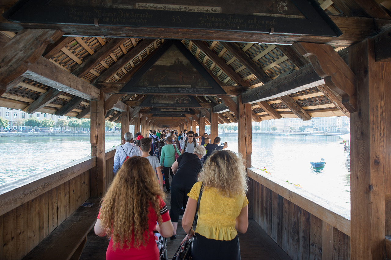 카펠교 역시 관광객으로 가득하다. 그나마 물 위에 있고 목조 건축물이라 그런지 다리 안으로 들어가니 조금은 시원하다. 카펠교에서 바라보는 구시가지 건물들은 크리스마스 카드의 한 장면처럼 아기자기하다. 파란 하늘에 나부끼는 빨간색 스위스 국기는 무채색 건물들 위로 또렷하게 흔적을 남긴다. 도시의 풍경과 아주 잘 어울리는 국기가 아닐까 싶다. 어쩌면 유럽의 국가들이 단순한 패턴으로 국기를 디자인한 이유가 화려한 도시 위에서 존재감을 드러내기 위함이 아닐까 싶기도 하다.