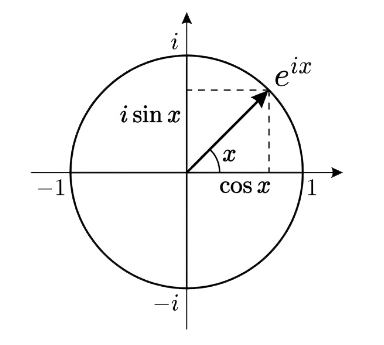 이 공식은 놀랍게도 '지수 함수(쭉쭉 뻗어나가는 것)'를 '삼각 함수(원을 그리며 도는 것)'로 바꿀 수 있음을 보여줍니다. 우리는 문과이니 복잡하게 생각하지 말고 그림만 보자고요. 반지름이 1인 원을 놓고 위의 공식대로 x값을 바꿔주면 아래 그림같은 관계가 만들어집니다.