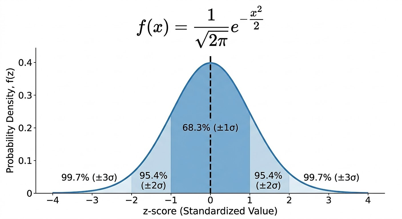 시험 성적이나 아이큐 분포에도 종종 사용하는 정규분포가 있습니다. 문과생에게는 공포의 대상이죠. 이 정규분포를 나타내는 '종 모양 곡선'의 식에도 ℯ가 들어갑니다. 우리 사회의 평범함과 비범함을 가르는 기준점에도 이 성장의 상수가 숨어 있는 것이죠. 정규분포에 대해서는 나중에 다시 이야기를 할 기회가 있을 겁니다.
