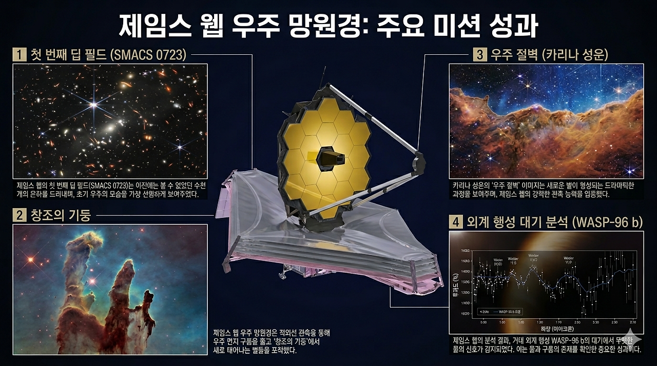 2021년 12월 25일, 크리스마스 아침. 아리안 5 로켓이 JWST를 싣고 지구를 떠났습니다. 발사 후 6개월에 걸쳐 망원경을 우주에서 펼치고 영점을 맞추는 작업이 진행됐고, 2022년 7월 드디어 첫 사진이 공개됐죠. 그 이미지를 본 세계는 말 그대로 숨을 멈춰야 했습니다.