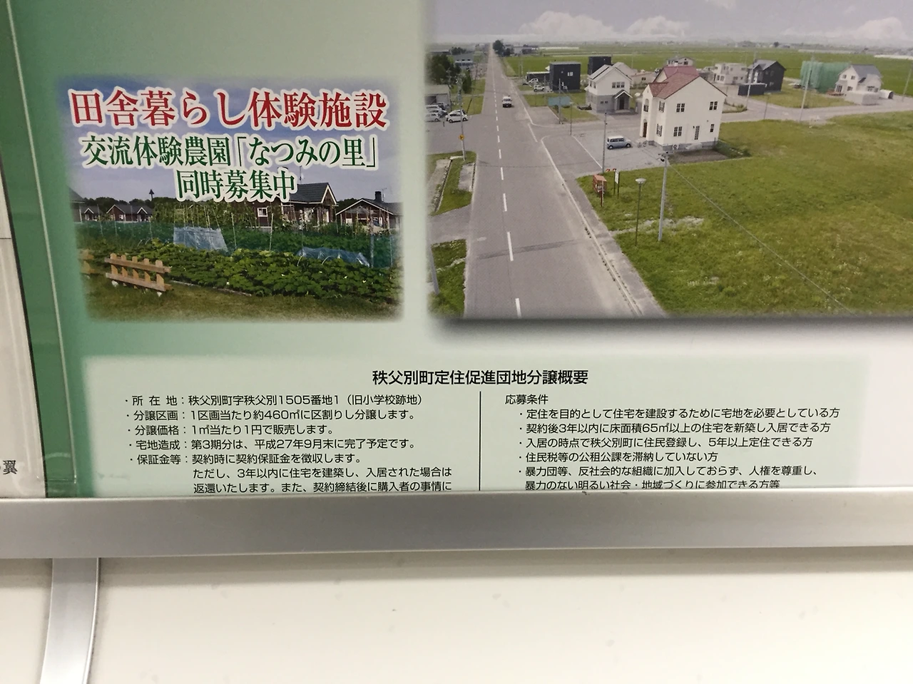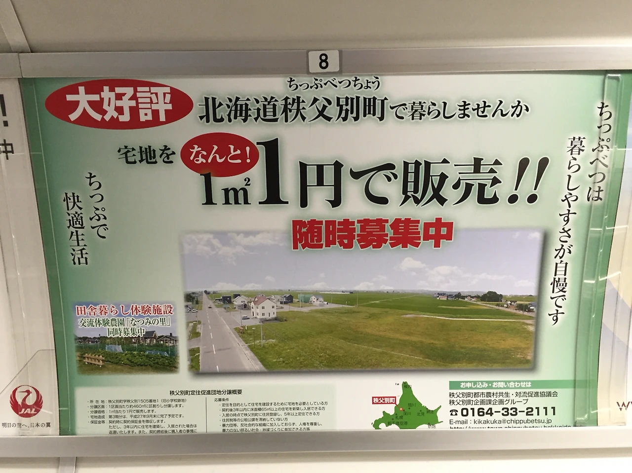 도쿄 지하철에 붙어 있는 평방미터당 1엔짜리 땅 광고. 대충 지도를 보니 홋카이도 시골 동네인 모양인데, 백 평이래도 삼천원, 삼십만 원이면 만평이다.
