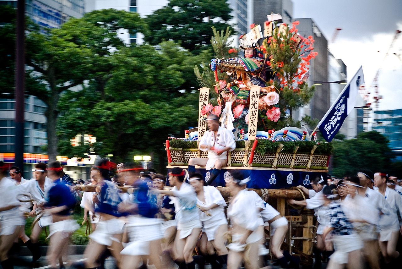 평소 같으면 아주 번잡한 거리지만 새벽은 역시나 차분하다. 구경꾼들이 모여들고 있기는 하지만 아직은 여유롭다. 한쪽에는 훈도시만 입고 엉덩이를 훤히 들어내 놓은 아저씨와 꼬마들이 물통을 두고 뭔가를 준비하고 있다. 최근 들어 일본에 자주 드나들고 있기는 하지만 훈도시는 처음 본다. 눈에 설고, 어설퍼 보이기도 하지만 일본의 여름 날씨를 생각해 보면 한편으로 이해가 가기도 한다. 한증막 같은 여름을 버티기에 최적의 복장이 아닐는지....