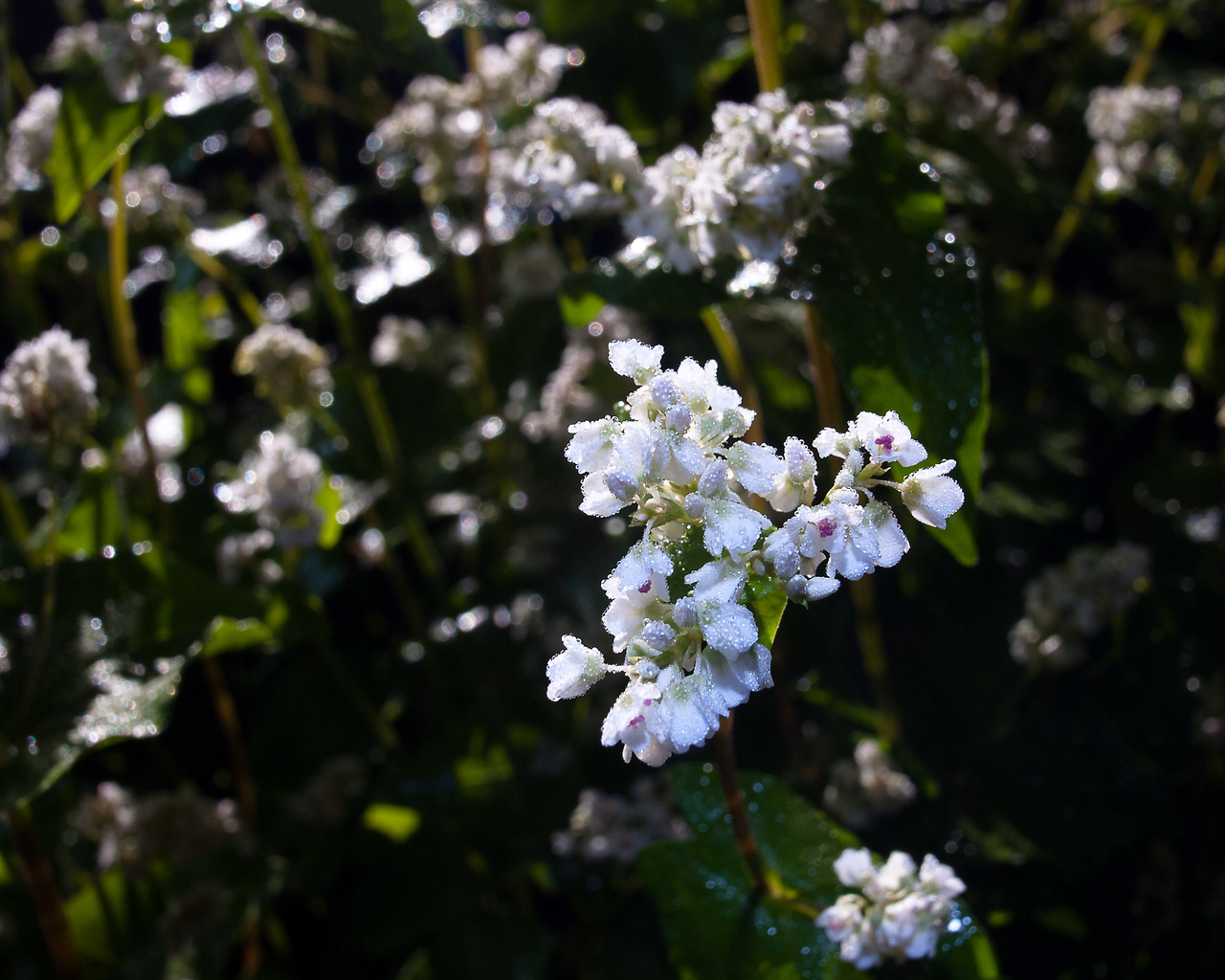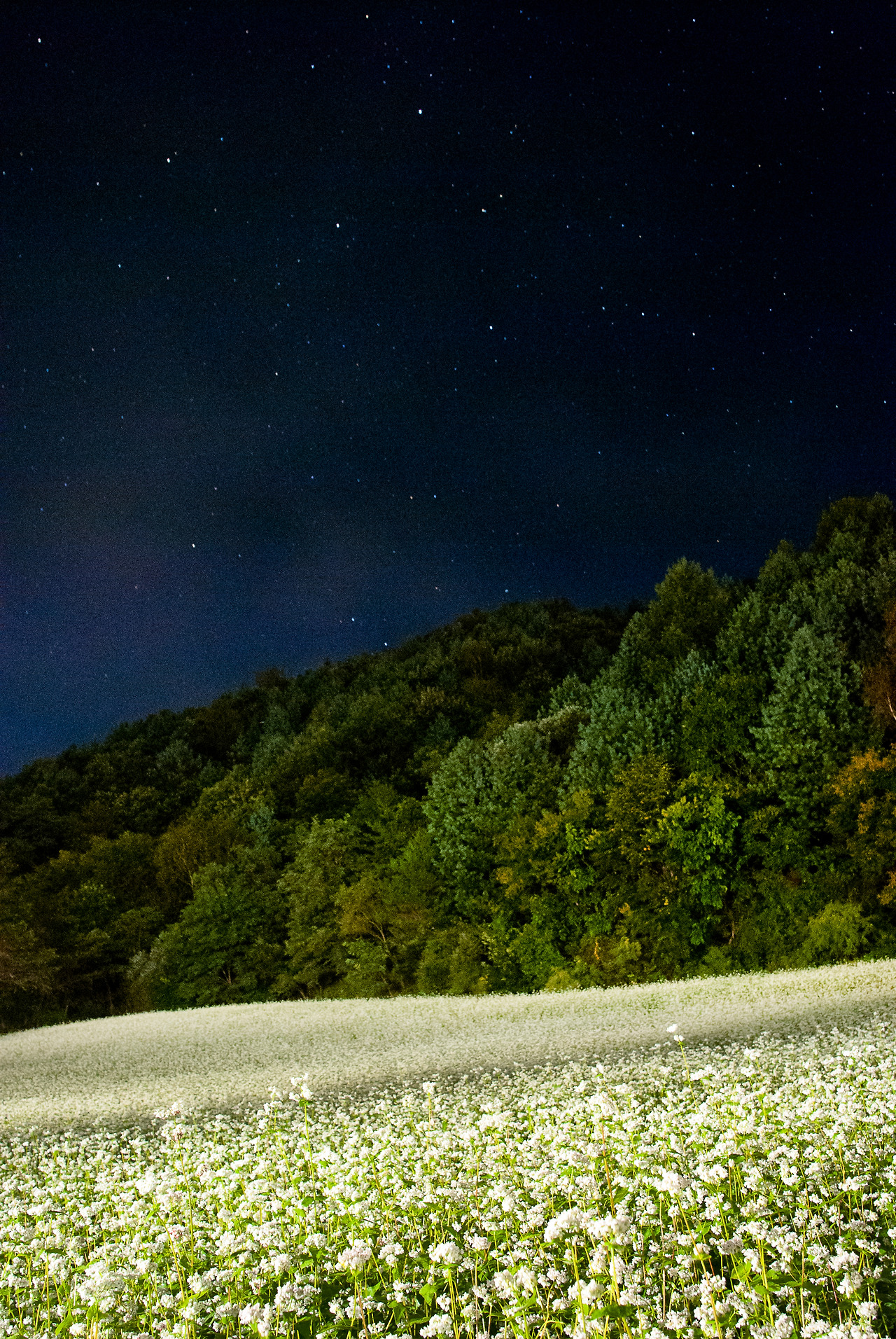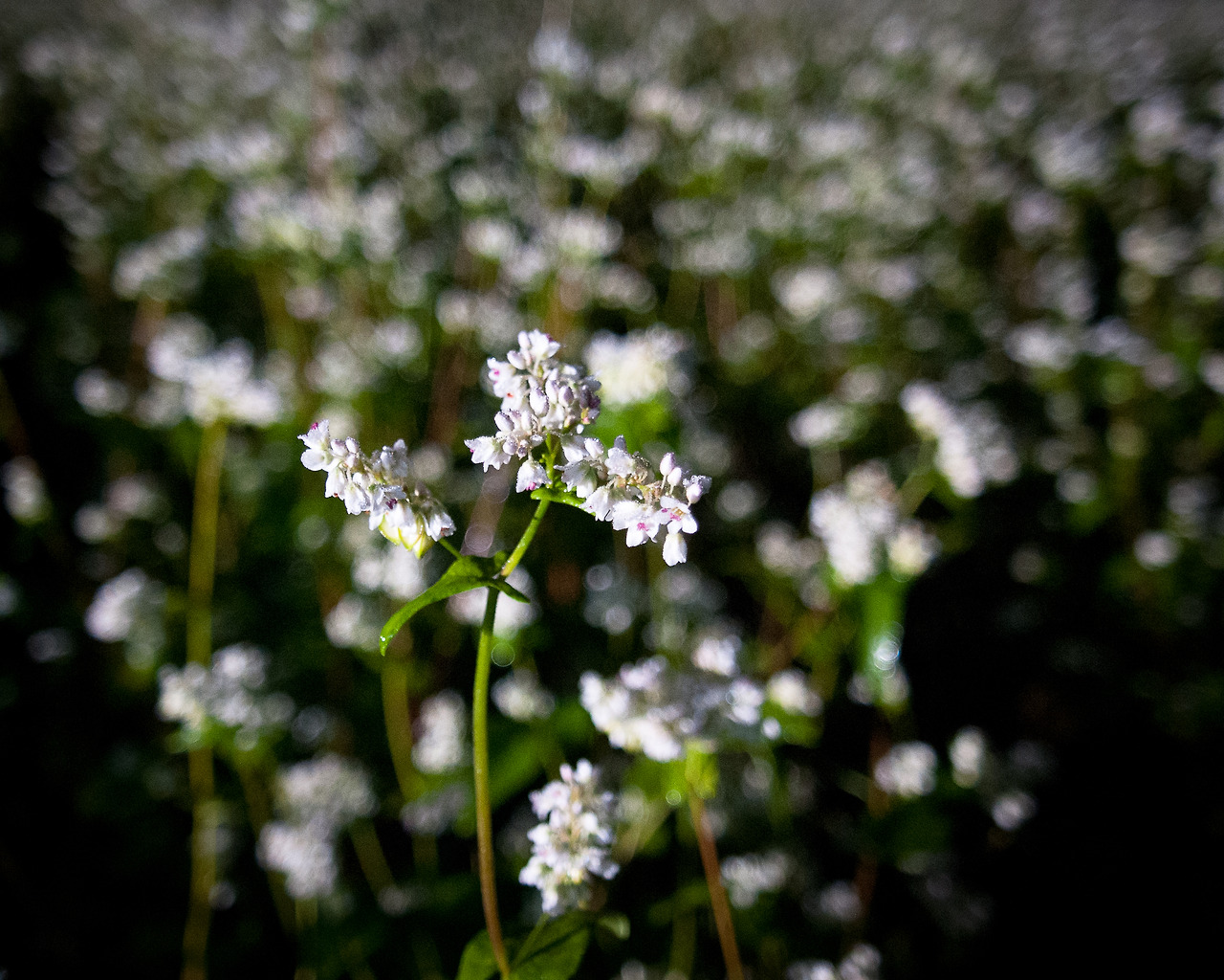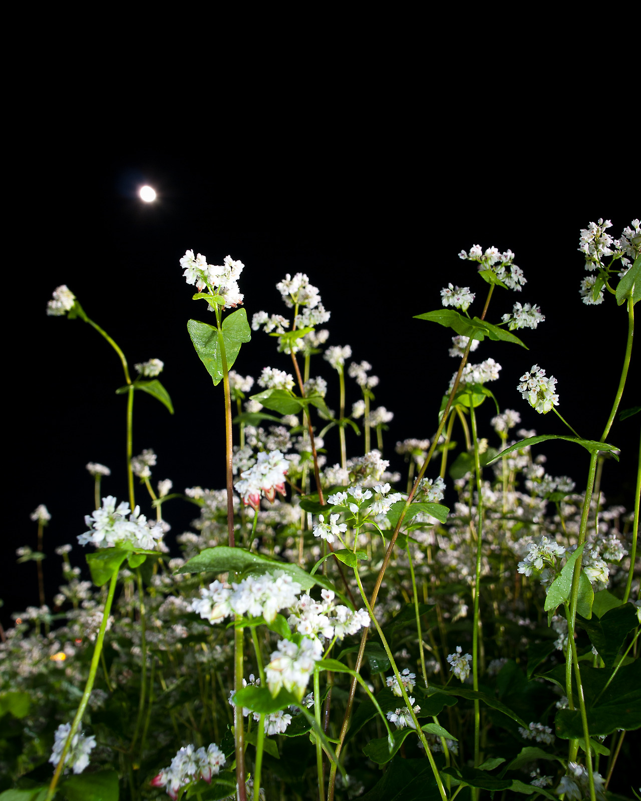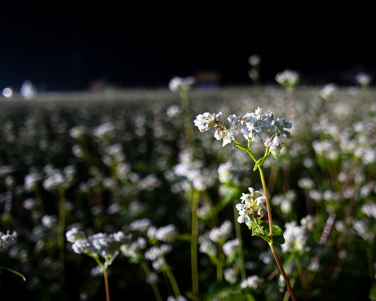 급격하게 떨어지는 기온으로 인해 메밀꽃들은 밤이슬을 머금고 있고, 차가운 밤공기 속에서도 메밀꽃은 하얗게 빛나고 있다. 밤하늘을 환히 비추는 달빛 덕분인지 투명할 정도로 흰 색을 띠고 있다. 매크로 렌즈를 두고 온 게 무척이나 아쉬웠지만 20mm 광각렌즈로도 충분했다.