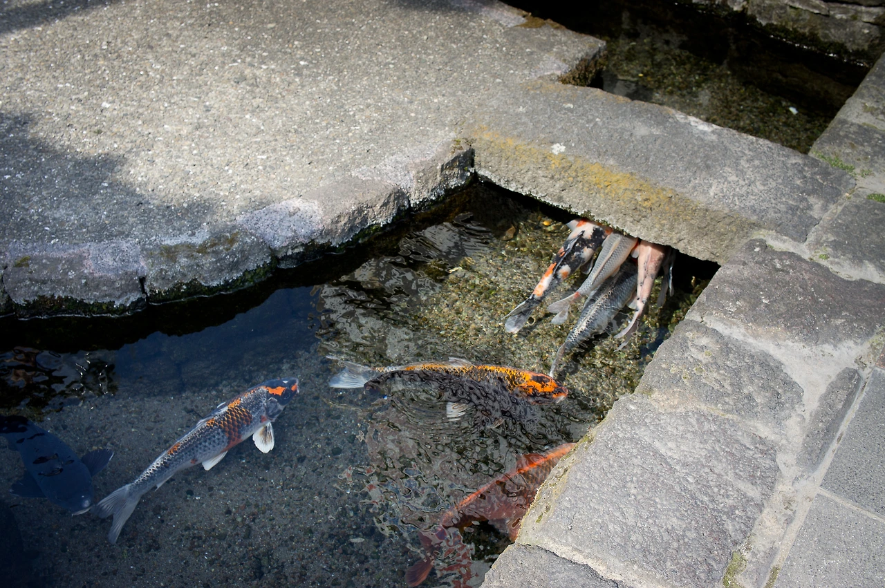 배가 부르고 나니 정말 조그만 골목길 옆의 도랑이 눈에 들어온다. 손을 씻고 싶을 만큼 맑은 물이 흐른다. 조금 걸어가니 제법 굵직한 파이프에서 맑은 물이 넘쳐 난다. 따로 모으는 것 같지도 않고 그냥 도랑으로 흘려 보낸다. 저 물이야말로 진짜 화산 암반수일 텐데... 정말로 잉어가 헤엄치고 다닌다. 그것도 내 팔뚝 만한 잉어가. 와우~~