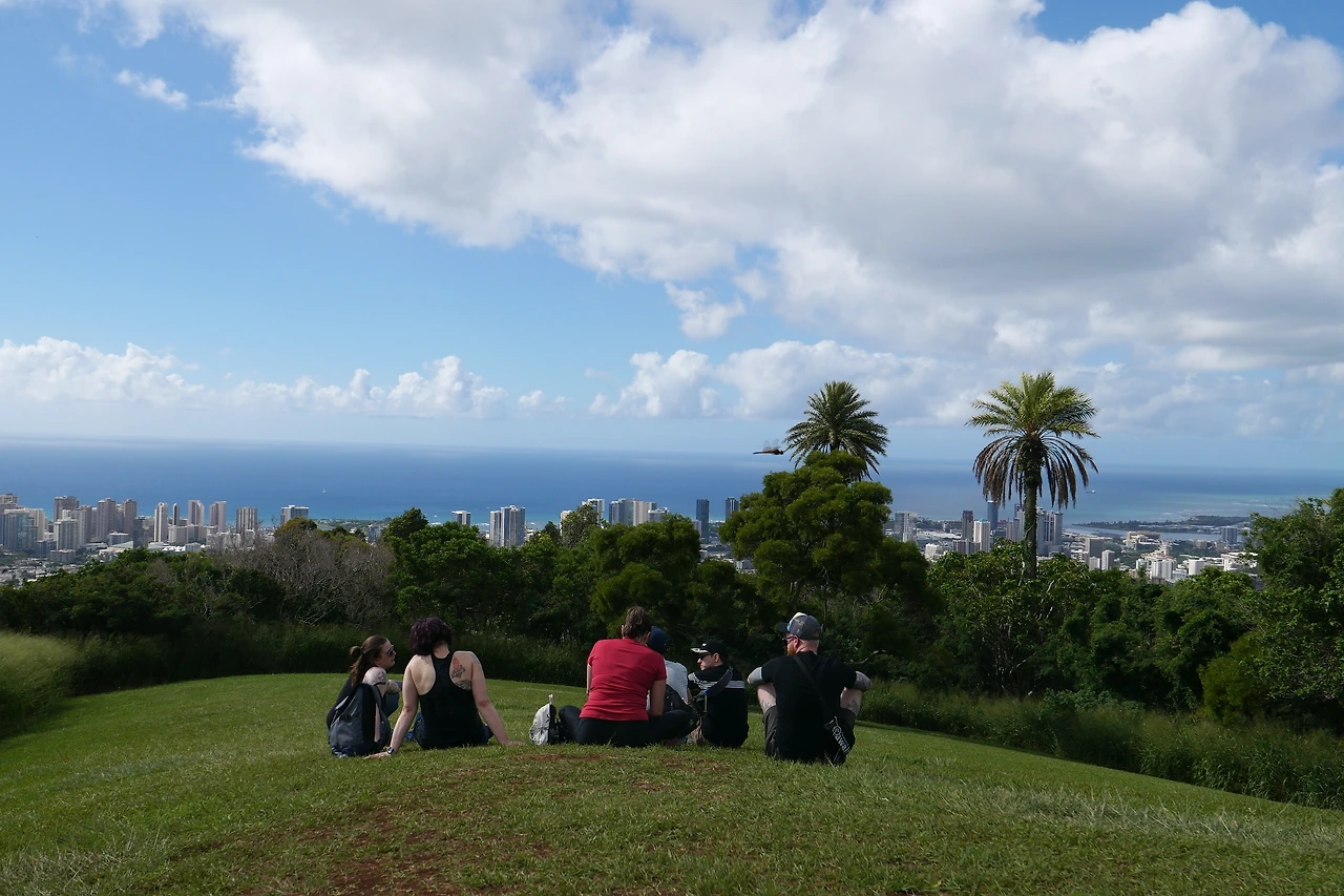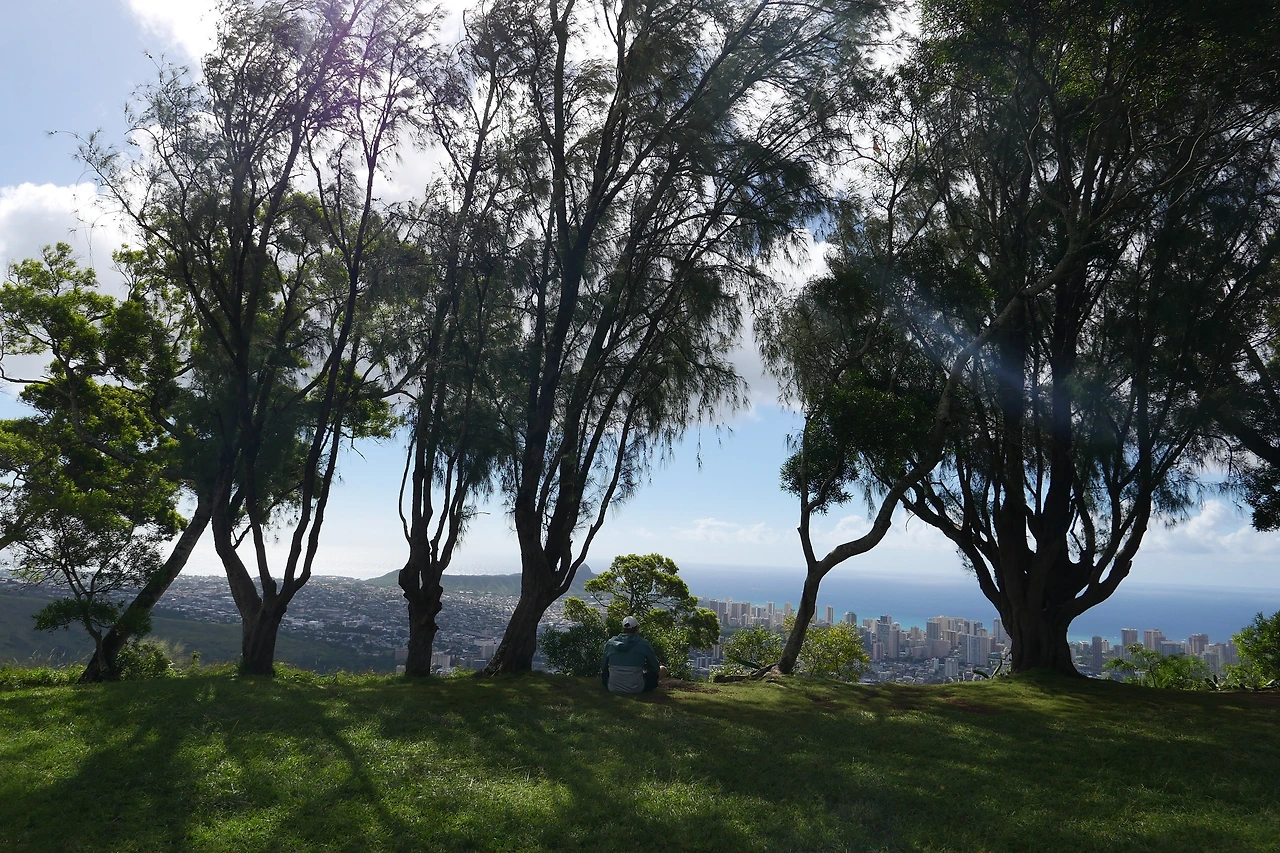 가이드 잭슨이 '다이아몬드 헤드'와 와이키키를 조망하며, 아무렇지 않게 잔디에 앉아 샌드위치를 먹는 모습이 그림 같다.