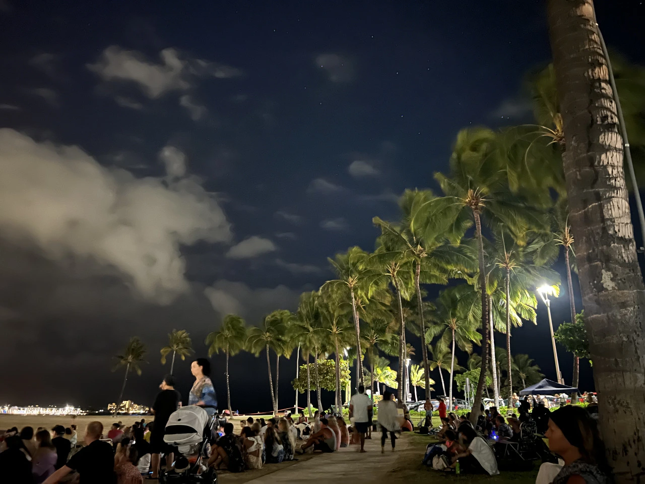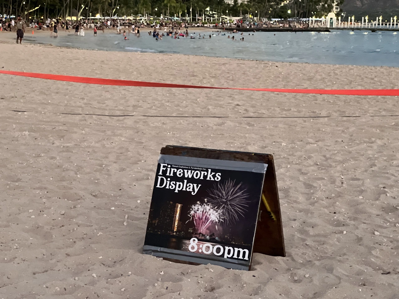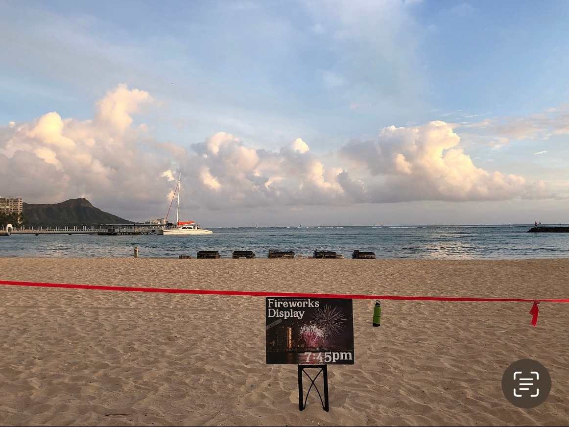 진행 시간 전에 가면 아마 사람들이 각자 자리 잡고 앉아 있을 거예요. 미리 가셔서 좋은 자리 잡고 앉아서 보셔도 되고, 근처에서 보셔도 무관해요. 개인적으로 전 불꽃놀이는 사운드도 중요하다고 생각하는 1인이라 가능하면 주변에서 보는 걸 추천드려요(와이키키 비치에서는 대부분 조망 가능해요).