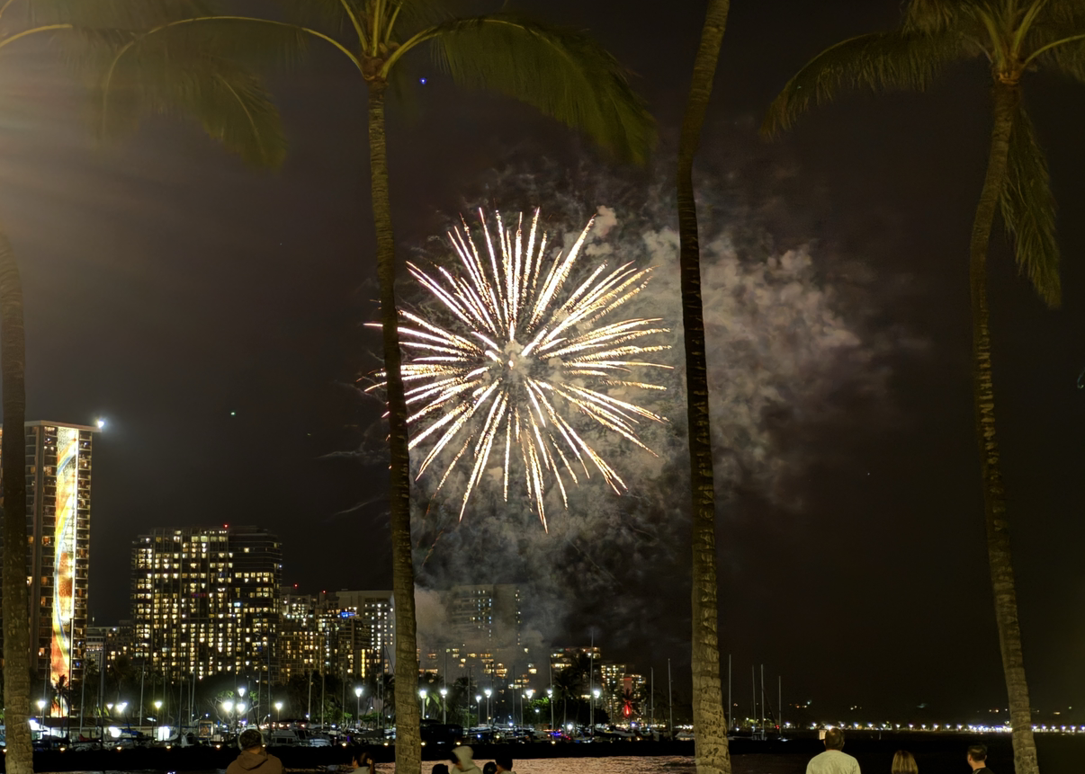불꽃놀이 보면 좋은 곳으로 불꽃놀이가 열리는 비치 및 인공라군 쪽, 힐튼 빌리지 내 '트로픽스' 레스토랑, 알라모나아 비치, 와이키키 비치가 있으며 일부 호텔에서는 객실에 따라 조망이 달라질 수 있습니다.