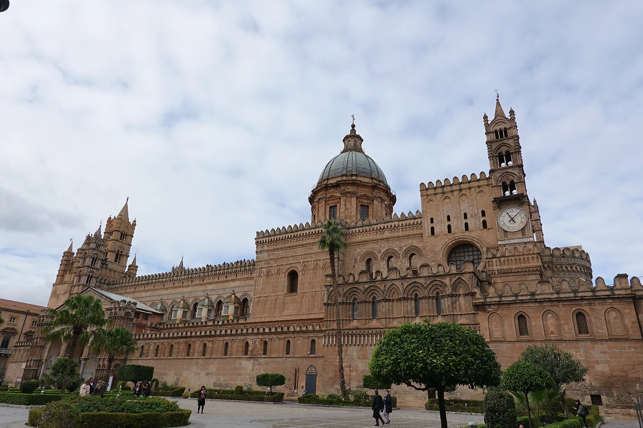 상자에 얼마인가 넣었다. 얼마를 넣었는지 기억나진 않지만 분명한 건 ‘업’된 나의 기분에 충족할만한 금액은 아니었다. 그건 자발적인 행위가 아닌 타의에 의한 반 강압적 행동이어서 아닐까. 여하튼 기분 좋았던 멜로디도 잠깐 사람들을 따라 걸었다. 사거리였지만, 여행자들로 보이는 이들은 유독 한쪽을 향했다. 남편은 여행자를 가리키며 이들을 따라 가면 뭔가가 나올 거라고 했다. 여행자를 따랐지만 어느 순간이 지나자 처음 따라 걸었던 일행들과 거리가 꽤 차이 났다. 신기한 것도 별로 없었는데 우리 걸음은 마치 거북이 같았다. 그렇게 팔레르모 여행의 1번지라 불리는 ‘팔레르모 대성당(Cattedrale di Palermo)’ 앞에 도착했다. 성당 입구에도 변함없이 트리오 연주자가 있었고, <걸어서 TV 속으로>에서 자주 듣던 음악이 사람들의 설렘을 극대화시키고 있다. 연주자들은 이 추위가 아무렇지 않은 듯 꽤 가벼운 차림으로 연주를 이어갔고 동양인으로 보이는 여자 서-너 명은 흥이 돋았는지 갑자기 짝 맞춰 춤을 추기 시작했다. 마치 무도회장 같다.