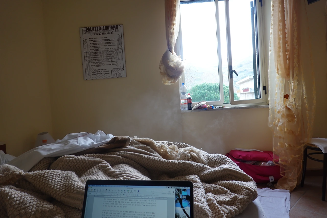 ‘이불 밖은 위험해’라는 말은 이럴 때를 두고 쓰는 말인가 보다. 플리스 집업을 입고 목도리를 하고도 몸을 잔뜩 움츠리고 잤는지 온 몸이 쑤신다. 벽에 붙어 있는 난방기는 폼인지, ‘호’하고 입을 떼니 입김이 나온다. 이 호텔에서 가장 따뜻한 곳은 이불 속이다. 팔라쪼 아드리아노의 둘째 날이 밝았지만 좀처럼 이불 밖에서 나오질 못한다.