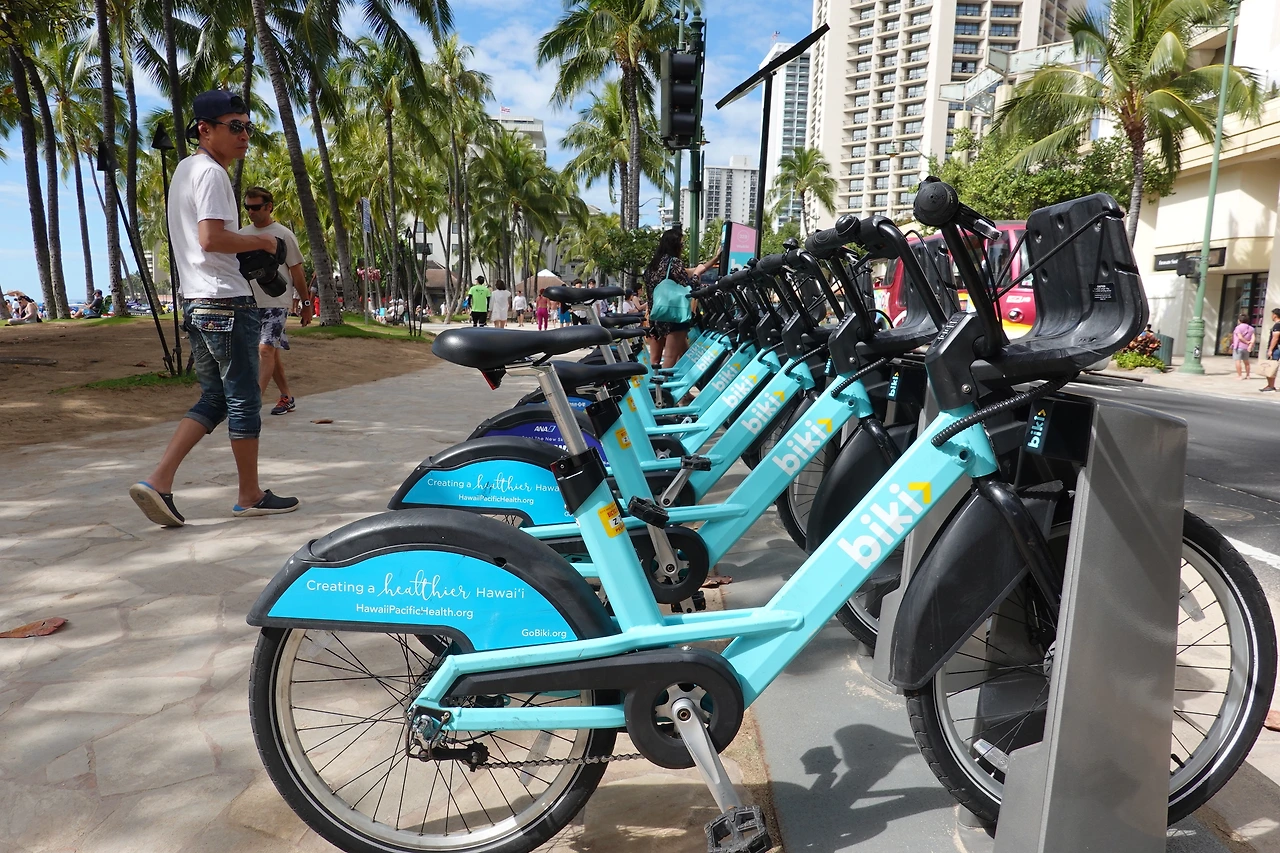 네. 대여 자전거 시스템이 도입되었답니다. 서울의 ‘따릉이’처럼 이용할 수 있는 자전거로 ‘비키(Biki)’라 부르지요. 빌릴 수 있는 스폿도 엄-청나 게 증가했고요. 와이키키 및 주요 관광 스폿을 거닐다 보면 정말 쉽게 만날 수 있어요. 이웃섬에서도 마련되어 있지만, 짧은 거리 움직일 때만 추천하고 싶어요. 오아후 경우 주요 스폿을 자전거로 이동할 수 있지만 마우이, 카우아이, 빅 아일랜드를 자전거로 즐겼다간 몇 날 며칠 누워있어야 할 수도 있거든요. 비키가 궁금하다면, gobiki.org 참고하세요.