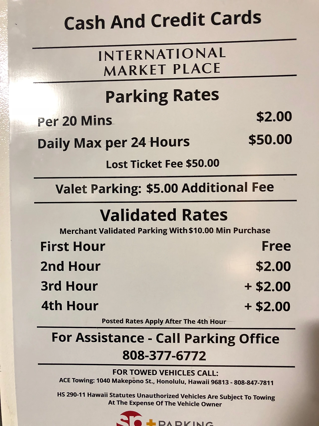 비싸다. 하지만 발품 팔면 무료 주차장이나 저렴한 주차장(1시간 1.5$)이용이 가능하다. 대부분 쇼핑몰은 무료 주차 혹은 구매 시 무료 주차 및 할인을 해준다. 비치나 공공장소 경우 무료 주차장이 있으니 걱정하지 않아도 된다.