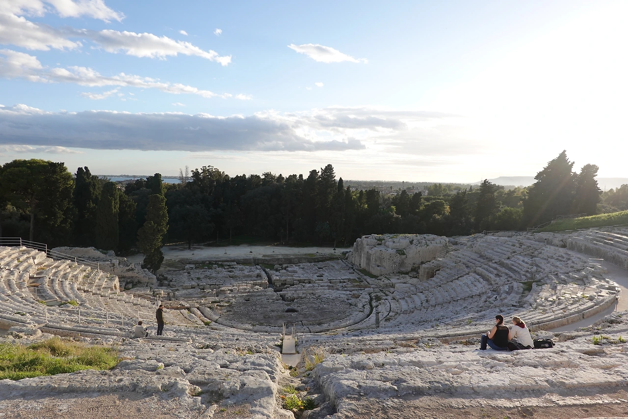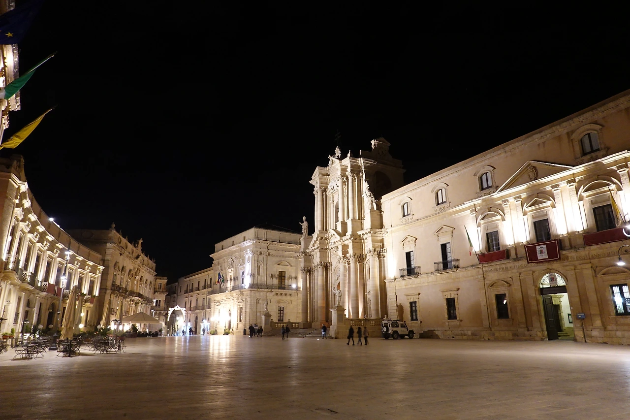 아레투사의 샘을 지나 골목을 통해 펼쳐지는 풍경이 낮과 또 다르다. 낮 동안 그리스 철학자 아르키메데스가 ‘유레카’를 외치며 뛰어다녔을법한 시라쿠사 대성당 앞 광장은 밤이 되니 말레나가 거니는 듯 그녀의 구두 소리가 ‘또각또각’ 하고 들리는 거 같다(<말레나>는 2001년 개봉한 영화로 모니카 벨루치가 주인공 ‘말레나’ 역을 맡았다). 성당, 시청이며 할 것 없이 중세 건물에 은은한 조명이 더해지니 한층 더 기품 있어졌다. 시라쿠사 대성당 앞 광장의 새하얀 바닥은 유독 더 반짝인다. 남편은 이 바닥이 마음에 드는 듯 한국에도 이런 종류의 타일로 광장 바닥을 했으면 좋겠단다.