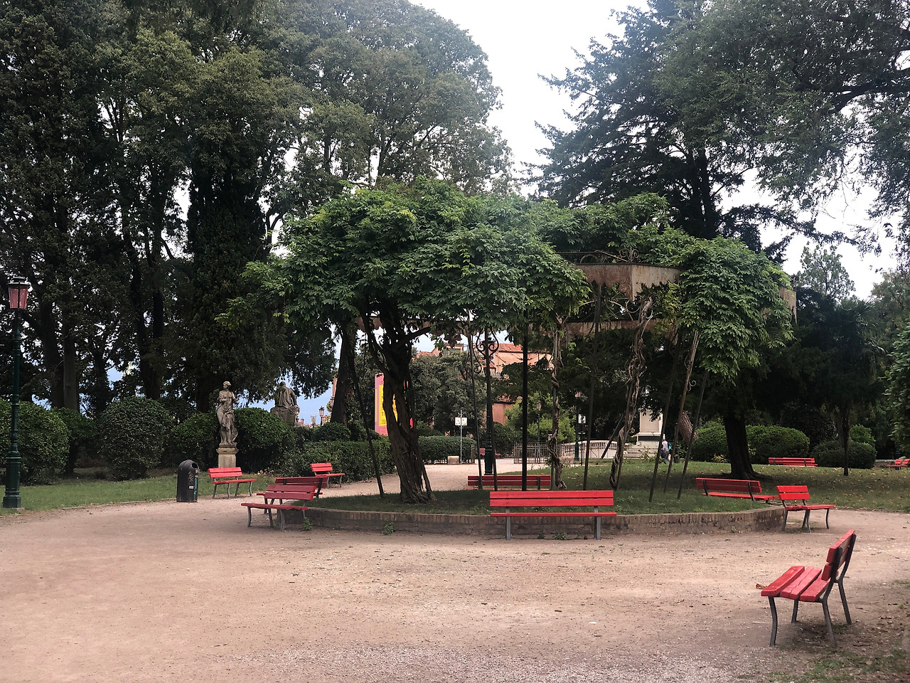 푸른 나무 숲 사이로 빠-알간 의자가 많다. 언제 어디든 앉을 수 있는 곳이 이렇게 많다니 너무 좋-다하고 속으로 외쳐본다. 길도 모르면서, 하지만 모든 길을 통한다는 지론을 가진 나로선 우르르 사람들이 움직이는 쪽을 따라 걷는다. 곳곳에 비엔날레를 안내하는 간판이 있다. 현지인들은 대수롭지 않게 여기는 것 같진 않지만 온 세계 미술인은 이 행사에 시선을 모은다. 한 때 미술계 종사했던 나로서도 비엔날레 기간 중 베니스를 방문해 각국의 전시와 기획전을 볼 수 있다는 건 꽤 흥미롭다.