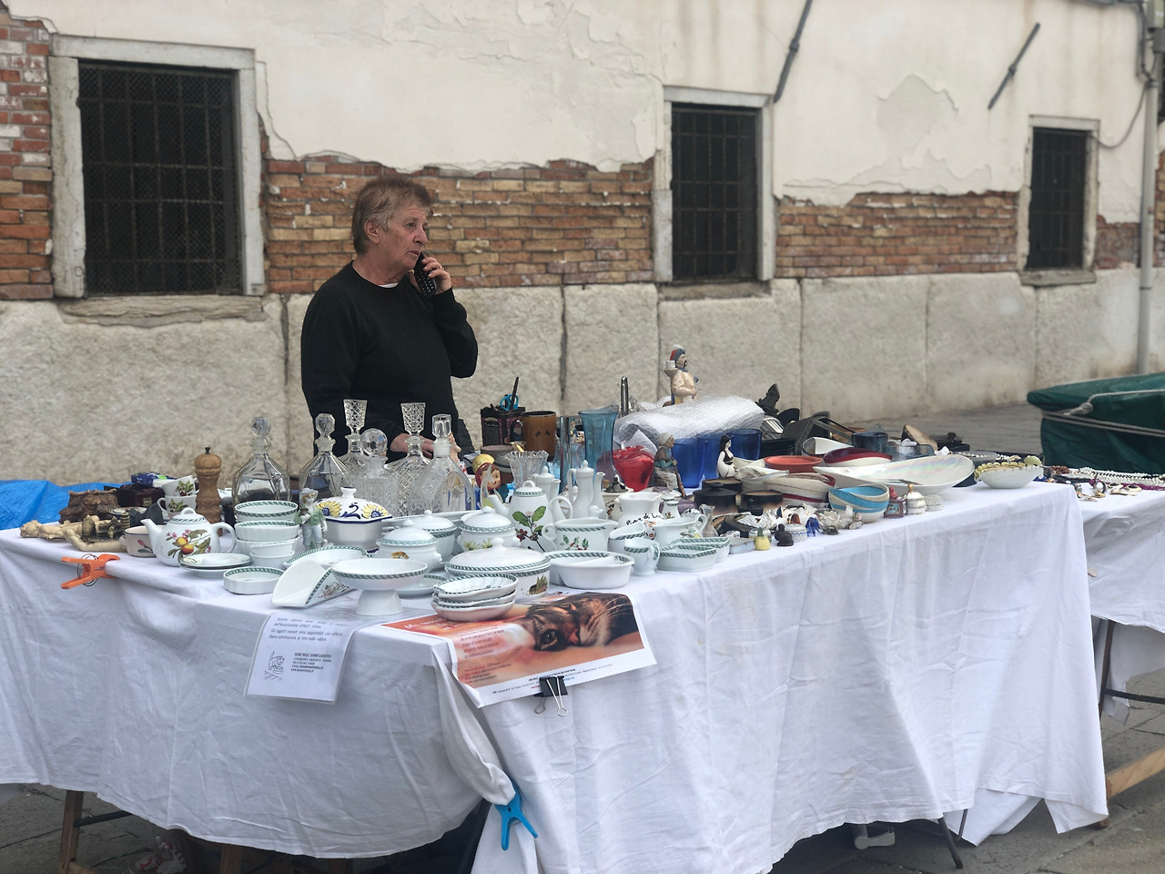 오전 8:00 아침 산책 대신 선택한 커피 한 잔에 시간이 흐른다. 다시 짐짝 같은 빨래 가방을 들고 숙소로 돌아오는 길, 밀린 빨래를 해치운 개운함때문인지 산책을 하지 않았는데 마치 한 것처럼 뿌듯하다. 아르세날레 바포레토 정류장 앞에 둥지를 튼 몇몇 앤틱 노상이 발걸음을 더디게 한다.