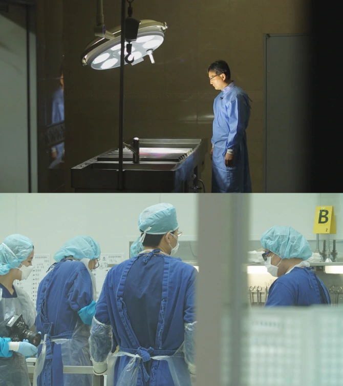 시신이 놓이면 가장 먼저 두피를 절개하고 톱으로 두개골을 절삭한다. 뇌를 적출하면 가슴을 Y자로 절개한다. 갈비뼈를 들어내고 뱃속에 출혈이 있는지, 혈관이 막히지는 않았는지 관찰한다. 관찰이 끝나면 장기를 적출해 시료를 채취한다. 이제 시신을 뒤집어 팔과 다리의 피부를 벗겨낸다. 여기까지 이르면, 부검 중인 시신은 사람의 형체를 거의 잃어버리고, 날것의 근육이 다 드러난 인체 표본같은 모습이 되어버린다. 근육조직 검사까지 마치면 시신을 봉합한다. 엉성하게 봉합된 시신 틈 사이로, 장기들이 다 적출되어 뻥 뚫려버린 가슴과 배 안으로, 잘라낸 두개골과 남은 장기를 바구니째 털어 넣는다. 부검이 끝난 시신은 밖으로, 새로 부검할 시신은 안으로, 컨베이어 벨트처럼 돌아간다.