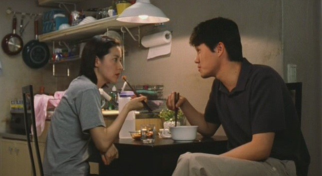 그에 반해 김치는 시간을 견디는 음식이다. 손이 가고, 정성이 들고, 기다림과 숙성이 필요하다. 김치를 담근다는 것은 단지 음식을 만든다는 의미를 넘어 한 계절을 저장하고, 생활을 이어가며, 시간을 함께 견딘다는 삶의 감각과 연결된다. 그러므로 상우가 김치 이야기를 꺼내는 순간, 사실상 사랑 이후의 미래를 말하고 있는 셈이다. 식탁과 부엌, 가족과 계절, 생활과 지속. 상우에게 사랑은 라면의 뜨거움에서 끝나는 것이 아니라 김치의 시간으로 넘어가야 하는 것이다.