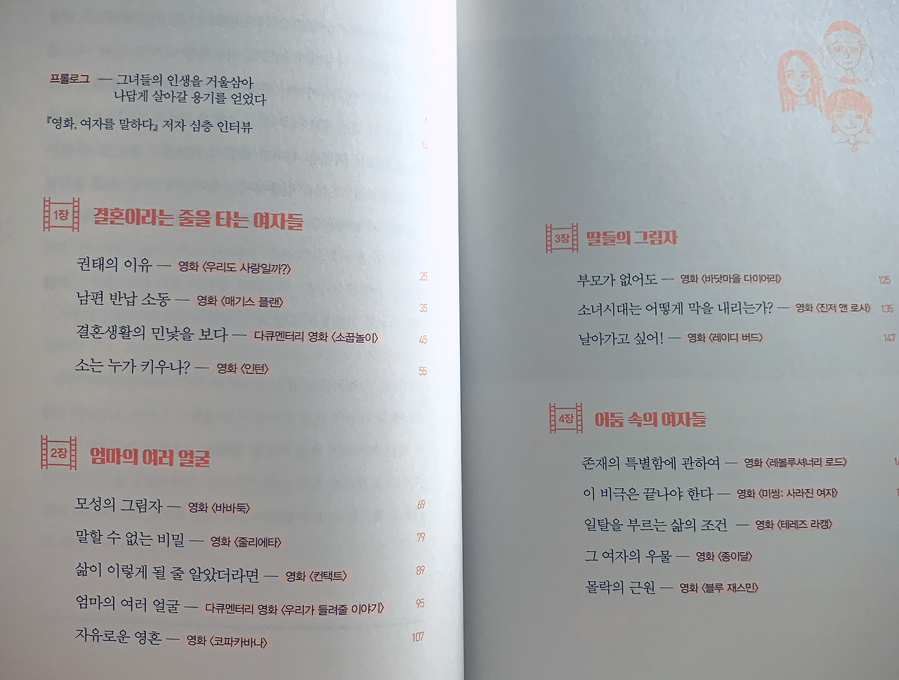 아무튼, 이 책은 어떤 ‘특정한’ 여성을 위한 책은 아닙니다. 사진 속에 제시된 책의 목차를 보시면 더 잘 이해되실 거예요. 아내, 엄마, 딸로서 살아가는 우리들, 그리고 성차별과 나이듦의 문제 등에 대해 다루고 있어요.