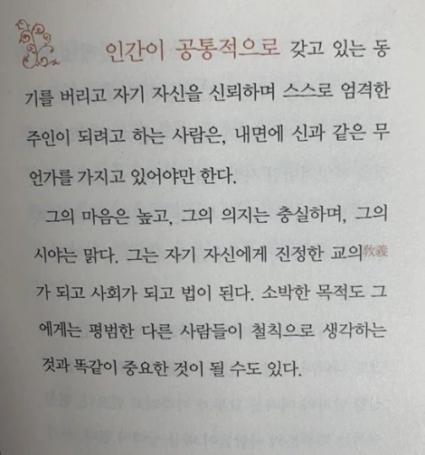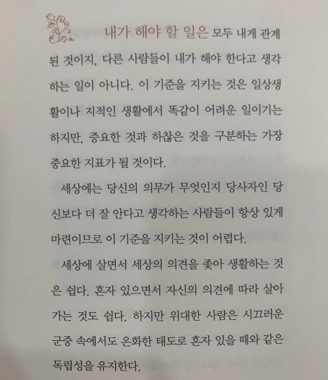 장미처럼 살고 싶다. 에머슨의 글을 읽으면서 이 책이 왜 2 세기가 넘는 긴 시간동안 전세계적으로 꾸준히 읽히고 사랑받는지 알 거 같았다. 그는 우리가 얼마나 귀한 존재인지 일깨우며, 거기엔 조건같은 건 없다고 말한다. 우리가 흔히 ‘자녀들은 부모가 믿는만큼 자란다’고 하는데 우리 자신도 우리가 믿는만큼 성장하고 발전하지 않겠나? 내 안에 아직 내가 모르는 힘과 가능성이 있다고 믿고 매사에 당당하게 지내야겠다. 자기 신뢰! 내가 나를 확실히 믿어주면 초조함은 사라지지 않을까?