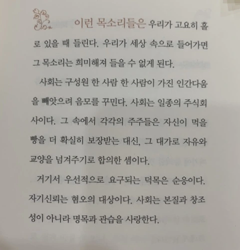 눈에 띄는 점은 에머슨이 사회 속에서 살아가야 하는 개인이 사회적 요구에 맞추느라 자기 내면의 목소리에 귀를 기울이지 못하고 살아가는 점을 크게 안타까워 한다는 것이다. 에머슨의 주장이 ‘나답게 살자’는 요즘 우리 사회의 트랜드와 너무나 잘 어울려서 놀라지 않을 수 없다.