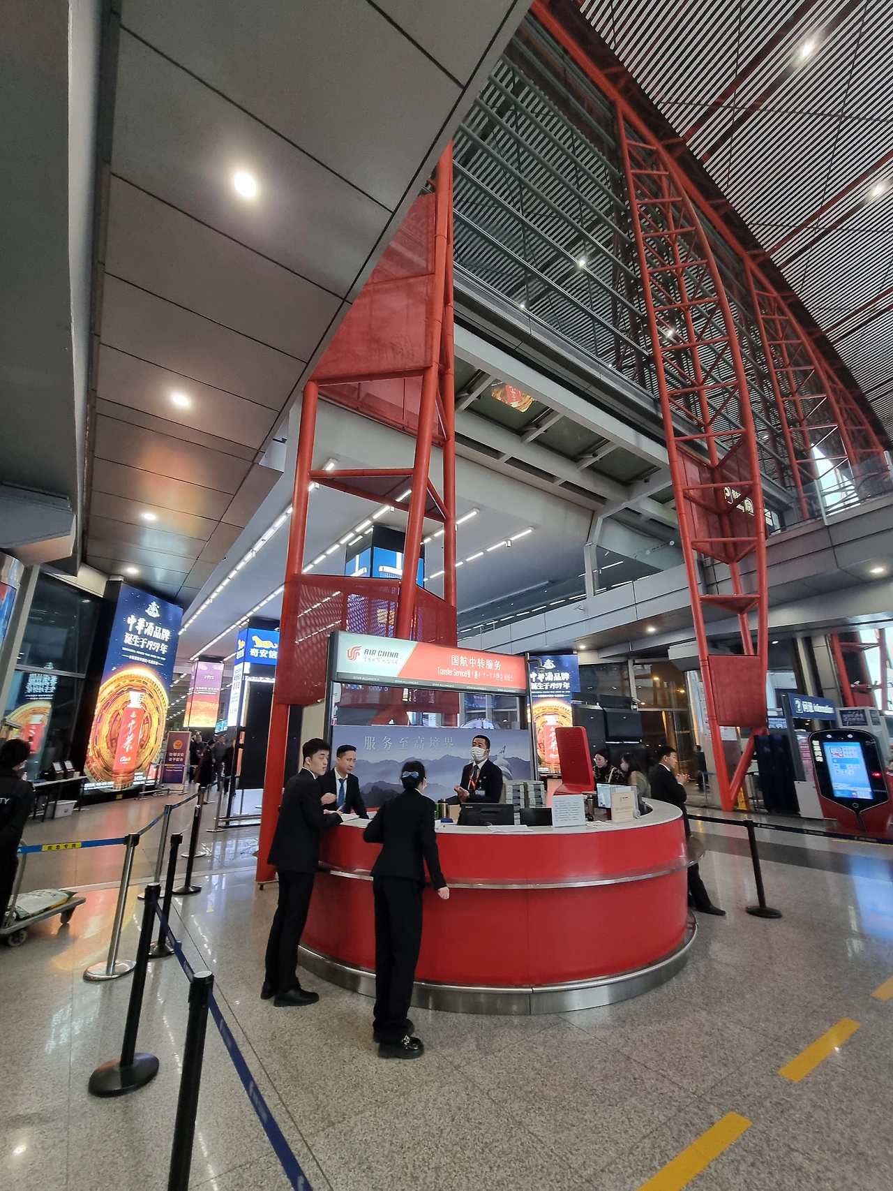 임시입국 당시의 상태는 위탁수하물은 최종 목적지인 파리로 바로 연결된다, 인천에서 인천-북경, 북경-파리 티켓 발권, 북경-파리 구간은 좌석은 확정받았으나 게이트는 미정인 상태로 임시입국심사를 받았다. 스무스하게 입국 허가를 받았다. 임시입국허가를 위 심사를 받기 전 입시입국카드를 작성하고 핑거프린트 바우처를 셀프기계를 통해 받는다. 두 개가 준비되었으면 여권, 임시입국카드, 핑거프린트 바우처를 들고 순서를 기다려 심사를 받으면 된다. 핑거프린트 바우처 기계에서 당황하지 말 것! 구형 여권은 기계에서 지문을 찍는 절차가 생략된다. 신형여권의 경우에만 지문 인식을 시키면 된다. 대신 임시입국허가릉 받으면 입국심사 시 심사대 앞의 기계에 한국어 안내를 받으며 지문과 얼굴사진을 등록하면 된다. 이렇게 이미그레이션을 통과하면 그대로 입국이다. 당연히 위탁수하물 수취 지역은 그대로 통과한다. 요즘은 건강 관련 서류를 작성하지 않는다. 그냥 나온다. 출국장을 나서면 이곳이 2층이고 B다. 그리고 나온 방향의 앞쪽에 에어차이나 환승안내센터가 있다.
