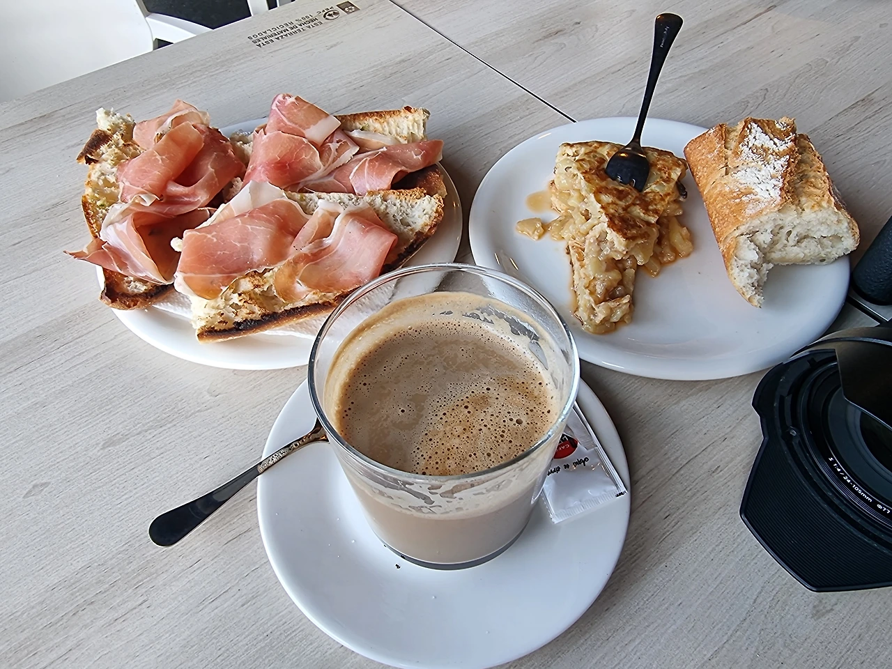 되지도 않는 스페인 단어 몇 개로 카페 꼰 레체 2잔(라테), 하몬 또스따다(하몬 토스트),또르띠야 데 빠따따스를 성공리에 주문하고 아름답고 풍성한 성찬을 맞이한다.