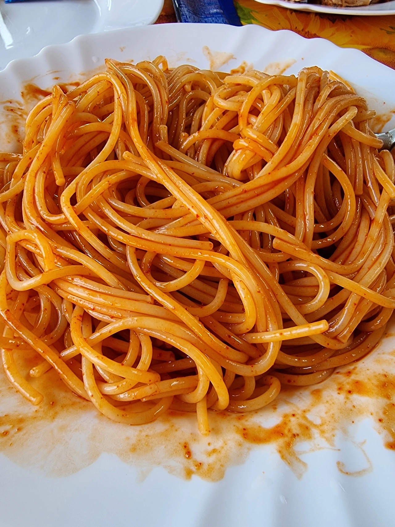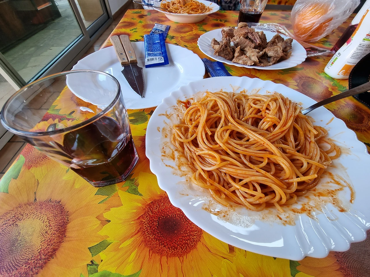 잠시 쉬다가 장 봐온 식재료로 비빔 스파게티와 이베리코 돼지고기구이, 오렌지, 요구르트, 돈시몬 팩와인 1리터, 하몬으로 훌륭한 저녁 만찬을 즐겼다.