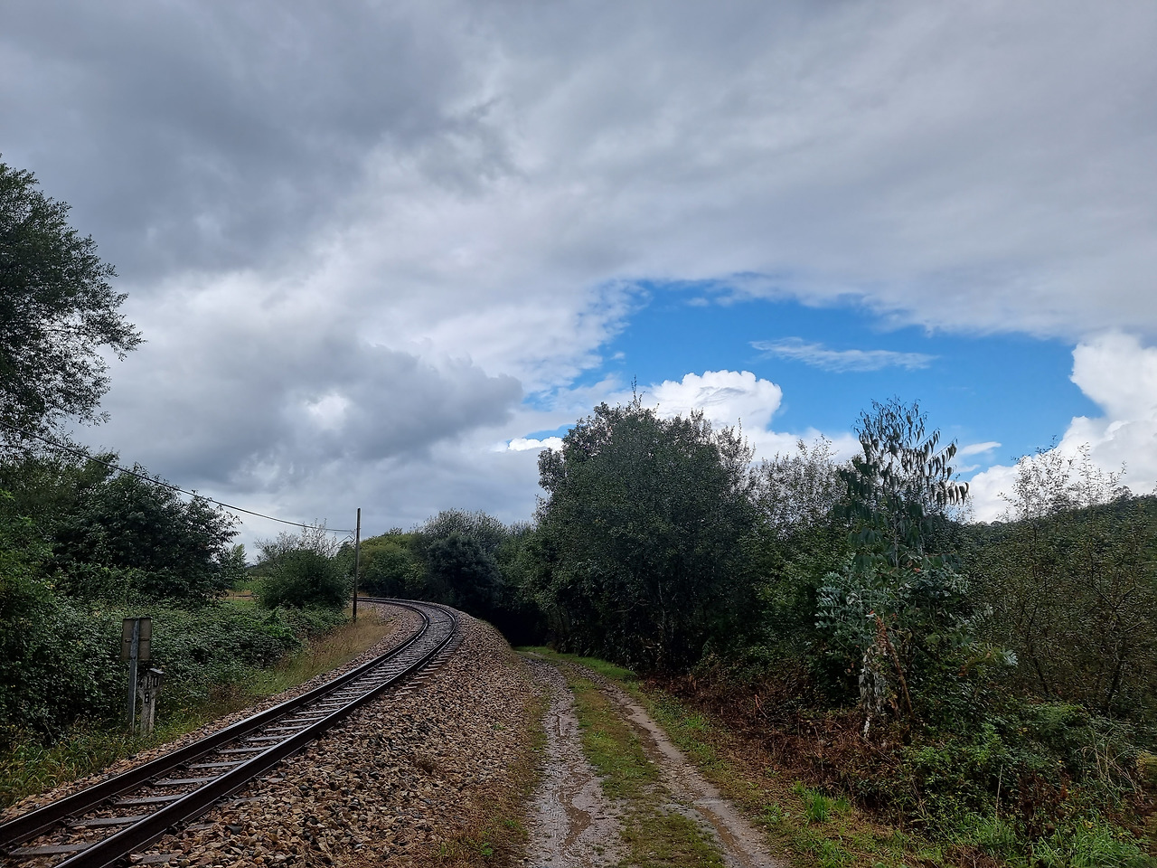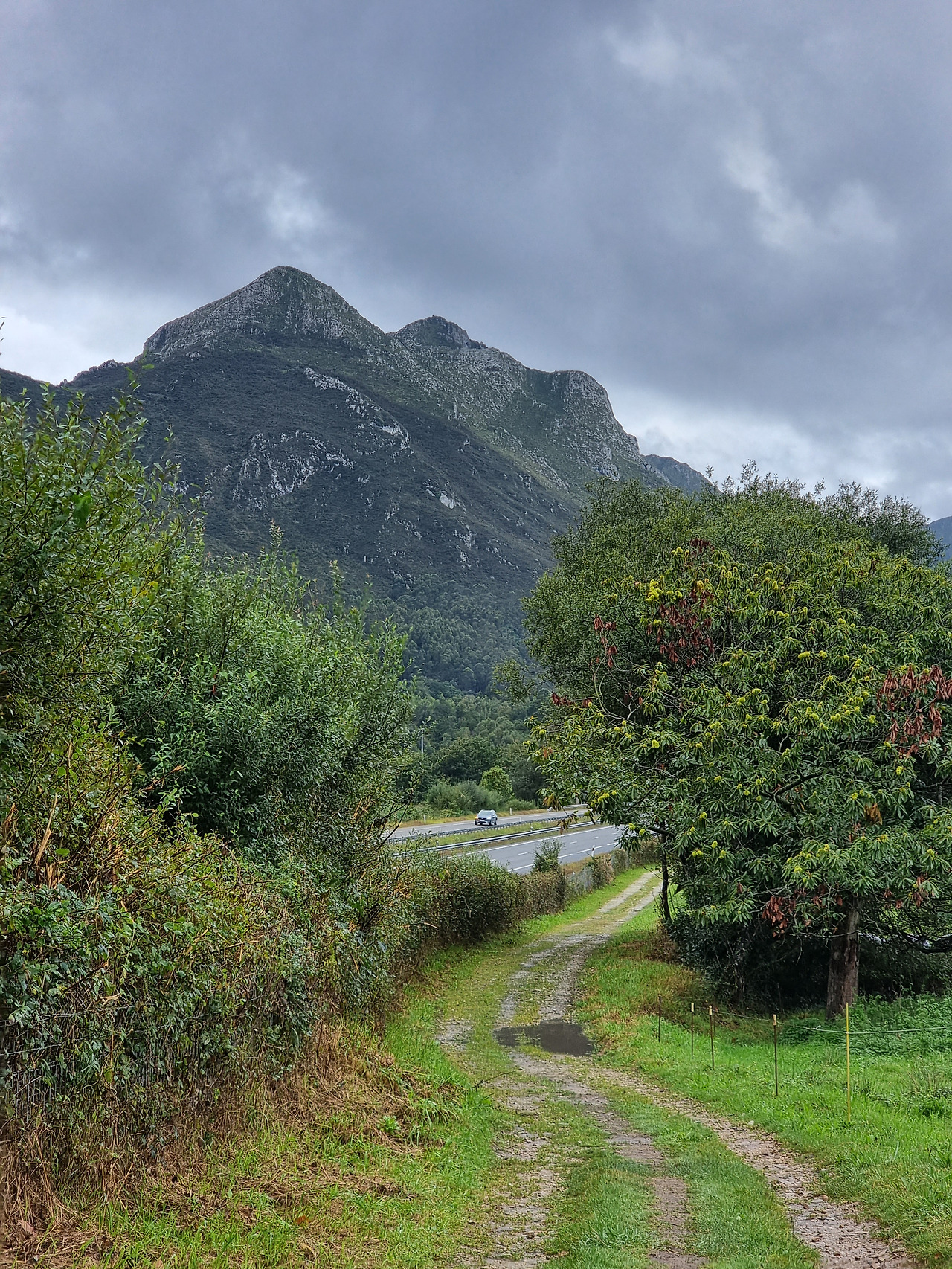 누에바를 지나 다음 마을로 가는 길은 기찻길도 있고 정면 왼쪽에 제법 높고 웅장한 산도 보인다. 제일 좋은 것은 비가 잠시 멈췄다는 점이다. 내리는 비를 구경하는 건 서정적이고 낭만적이지만 비를 뚫고 걷는 순례자는 피곤하고 힘들 뿐이다.