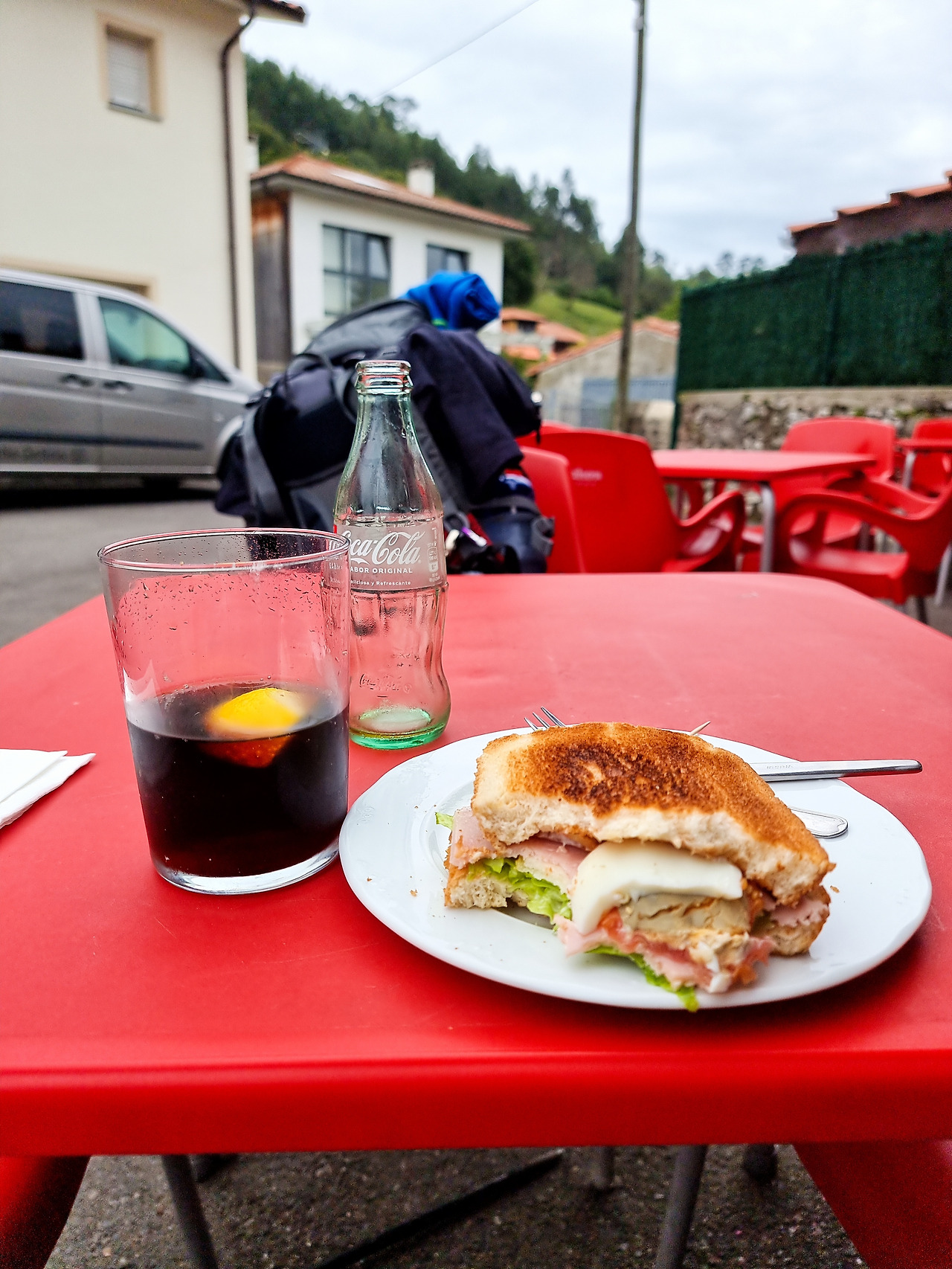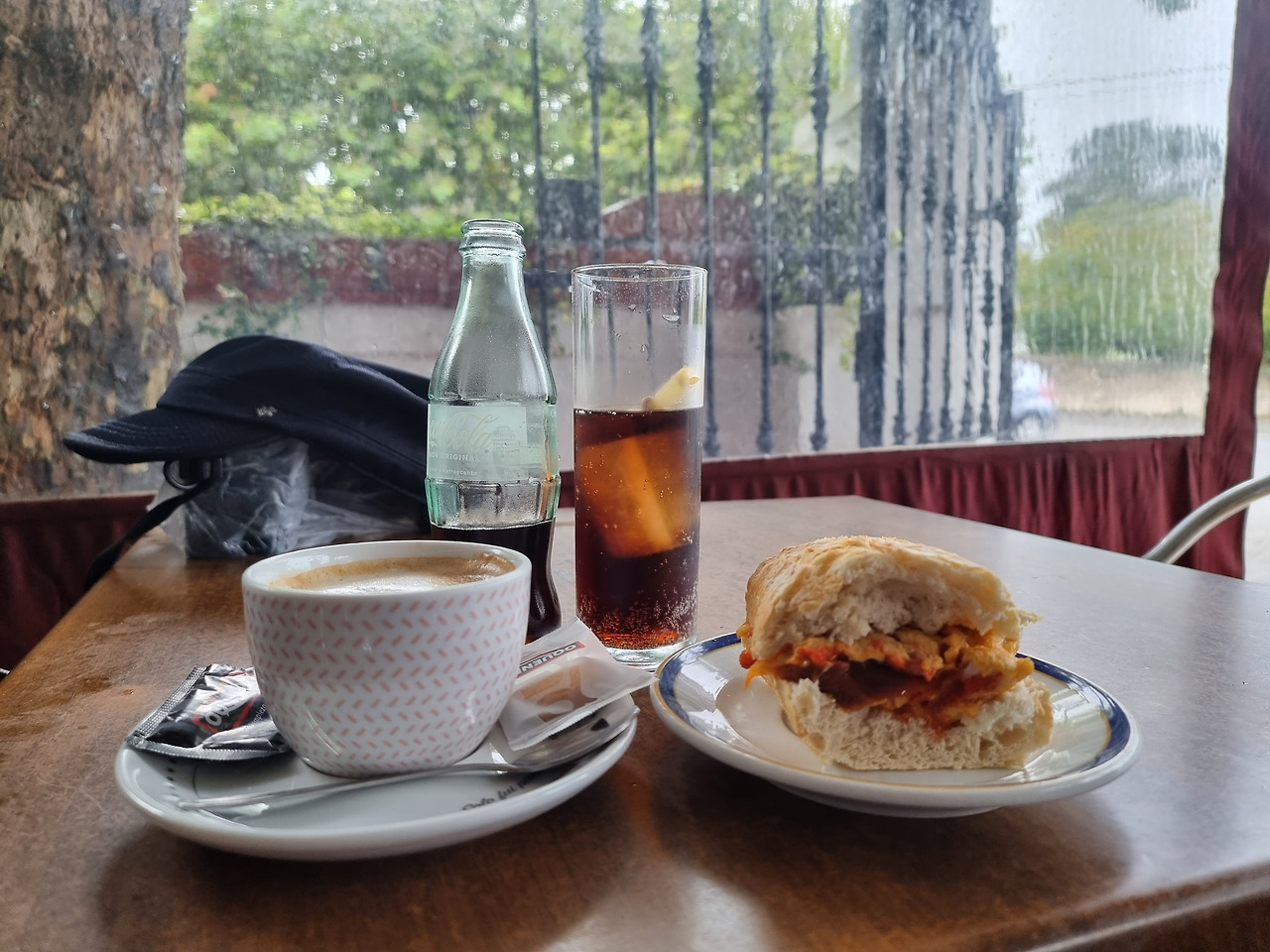 아침도 못 먹고 나선 길에 해변의 바르는 비 때문인지 원래 그랬던 건지 오픈한 곳이 없다.몇 시간째 비를 맞으며 쉬지도 못하고 걸은 끝에 조용한 마을 중심에 자리한 Bar Sidrería Casa Raúl(바르 시드레리아 까사 라울;시드레리아 파는 바르 라울의 집)이 나를 반기는듯 한데 사실은 주인장이 반기는? 어쨌든 나는 휴식과 요기가 필요했기에 반갑게 찾아 들어갔다. 마을을 몇 개나 지나왔지만 비 오는 아침 문을 연 바르가 없던지라 이곳이 왜 이리 반갑던지. 보까디요,까페 꼰 레체,코카 콜라를 시켜 놓고 한참을 앉아 오전 내내 맞은 비구경을 한다. 빗속의 나와 비밖의 나는 참 많이 다르다.