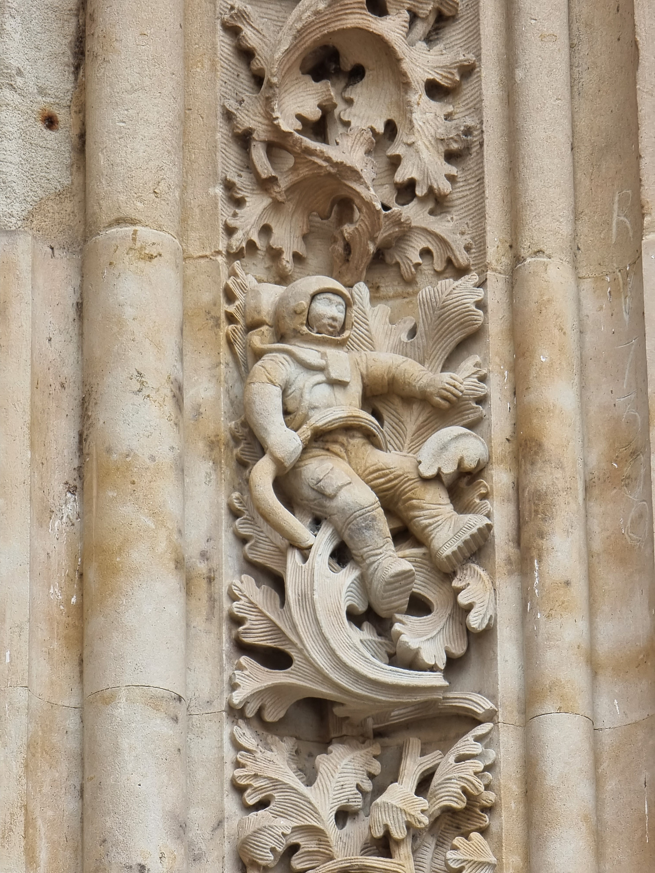 살라만까 대성당의 북쪽 출입구인 '라모스 문(Puerta de Ramos)' 왼쪽엔 잘 찾아보면 아래 사진과 같은 우주인 조각을 발견할 수 있습니다. 이 조각은 한때 '시간 여행의 증거'나 '외계인의 흔적'이라는 음모론의 소재가 되기도 했지만 사실은 1992년 복원 작업 중에 추가된 현대적인 요소 라고 합니다. 또 흥미로운 것은 살라만까 대성당은 구 대성당과 신 대성당이 서로 벽을 맞대고 붙어 있는 독특한 구조로 로마네스크부터 바로크에 이르는 유럽 건축사의 흐름을 한곳에서 볼 수 있는 걸작이라고 합니다.