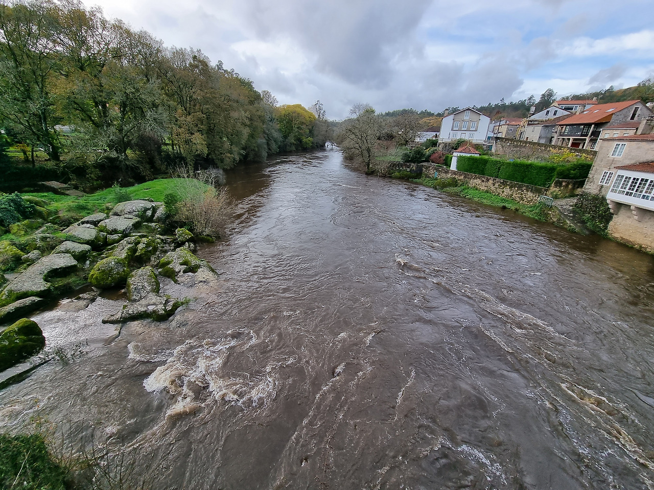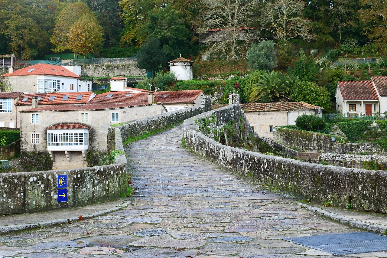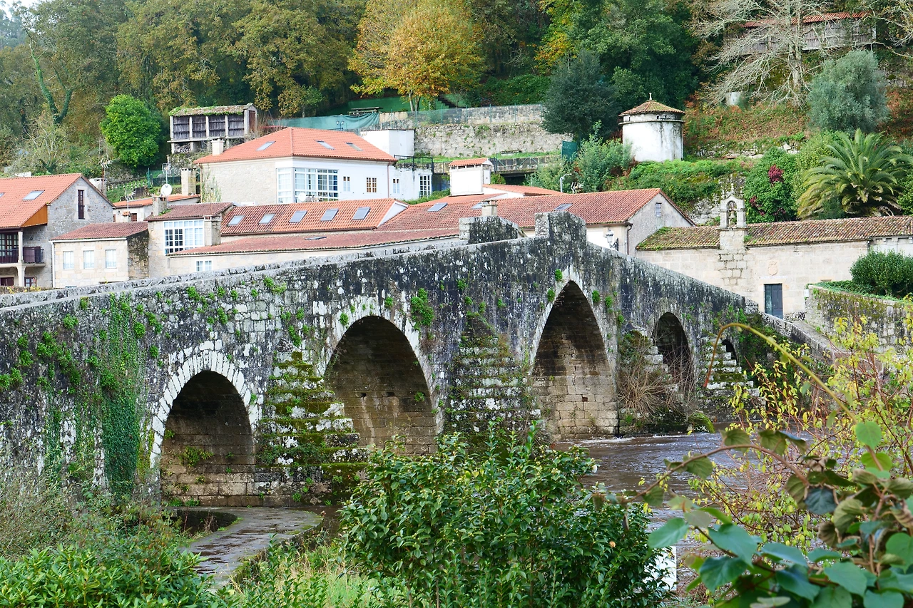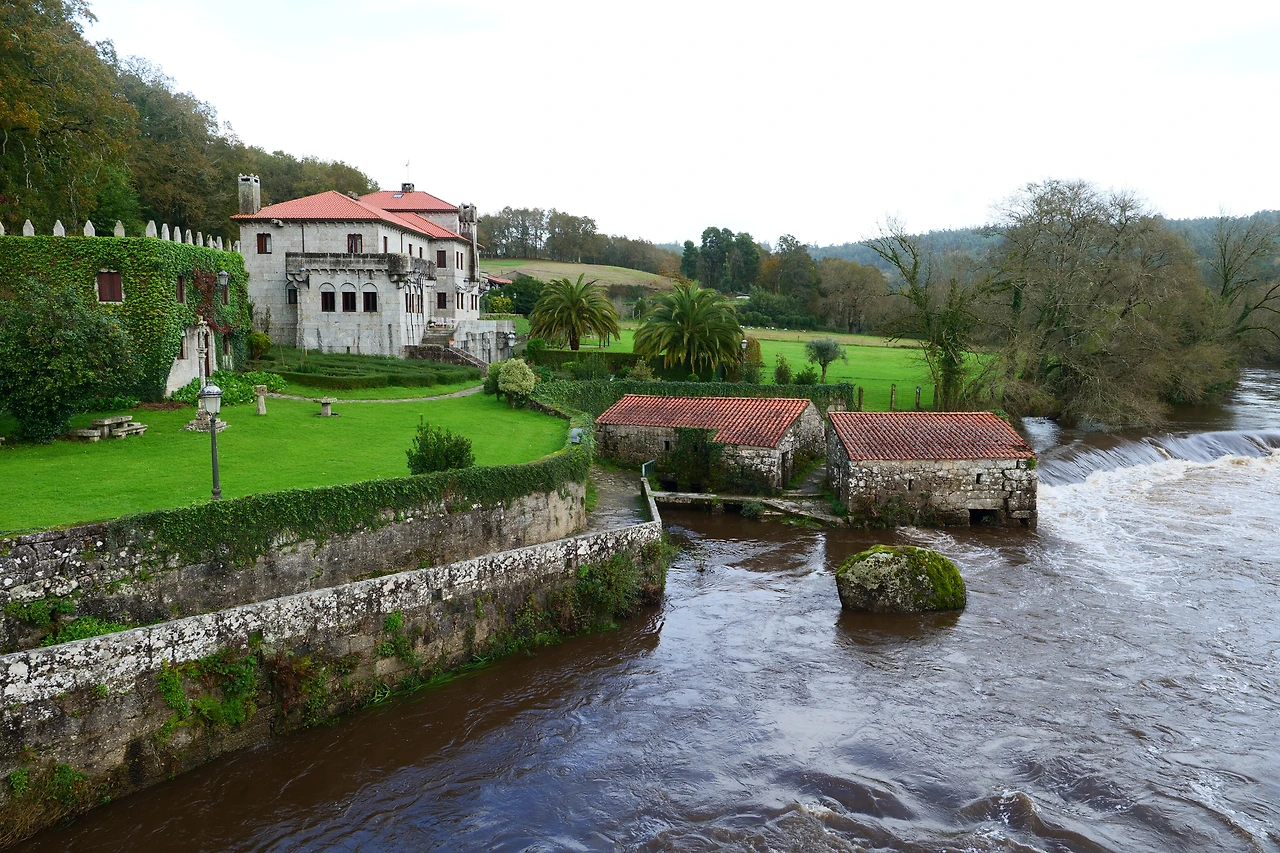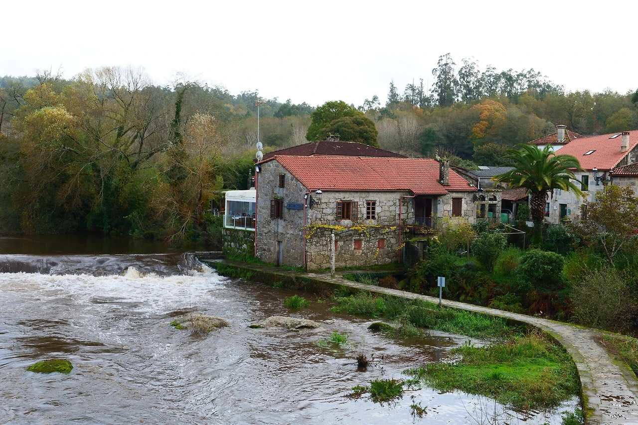 묵시아와 피스떼라 길을 걷다 보면 가장 인상적인 마을이라 꼽을 수 있는 'A Ponte Maceira' 마을은 Tambre 강이 가로지르는데 수량이 상당한 데다 강변에 붙여서 지은 건물과 다리, 아름다운 건물이 어우러져 매우 아름다운 쉬어 갈 만한 마을이다. 다리 건너기 전에 깔끔한 'Restaurante Pontemaceira(레스토랑)'가 생겼는데, 아름다운 강 경치를 보며 식사를 할 수 있다. 구글 검색을 해보니 식사비가 싸지는 않다. 1인당 30유로 내외. 그래도 한번 들러볼 가치가 있어 보였다. 나는 혼자라 슬쩍 지나며 구경하고 통과한다.