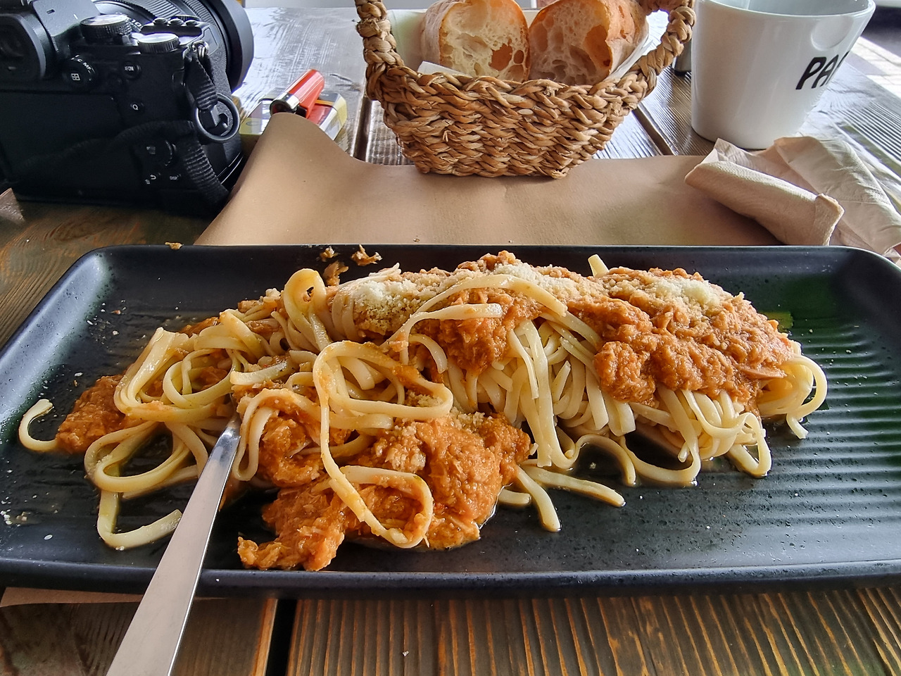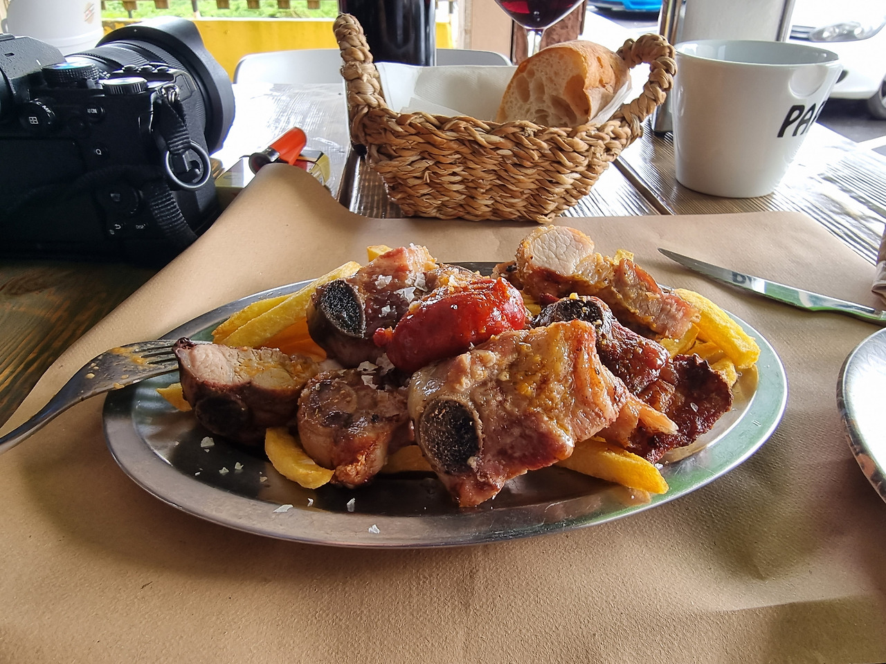 네그레이라 중심부의 바베큐 전문 식당인 듯 보이는 'A Esmorga (Negreira)'에 자리 잡아 점심을 거하게 먹어 볼 생각으로 메누 델 디아를 주문했다. 퍼스트는 파스타, 세컨드는 고기로... 양과 맛 모두 훌륭했다. 후식으로 아이스크림까지 12유로에. 행복한 식사였다.