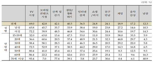<표1> 지난 1년 동안 가장 많이 참여한 여가활동 (복수응답, 상위 10개, 1+2+3+4+5순위)