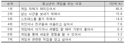 또 다른 문제는 청소년들이 게임을 하는 ‘이유’이다. 아래 <표2>에 따르면, 77%(상위 1위~3위)의 청소년이 재미, 시간 보내기, 스트레스 풀기 위해 게임을 한다고 답했다.