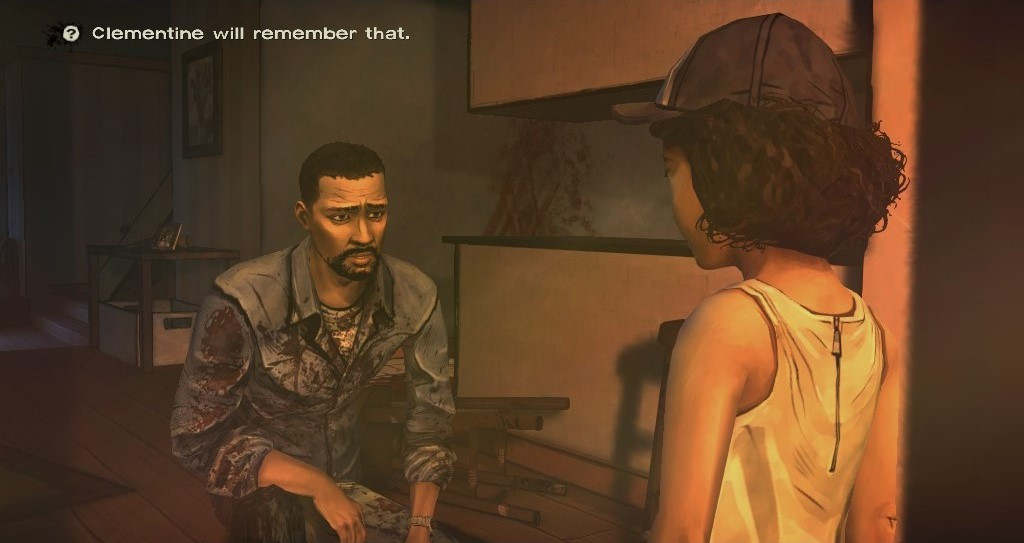 Lee와 Clementine이 함께 하는 여정은 그리 오래가지는 못한다. 예상하지 못한 상황에서 Lee가 좀비에 물리게 되는 사고가 발생한다. Lee는 인간으로 사는 삶이 얼마 남지 않은 상황에서 Clementine과 작별의 시간을 갖는다. 지금까지 플레이어는 워킹데드 서사 속 주인공 Lee로서 수많은 어려움을 헤쳐왔다. 소설이나 드라마 주인공에게 공감하는 것 이상으로 마치 내가 죽는 것 같은 아쉬움과 허무함이 느껴진다. Lee는 좀비로 변해 가면서도 Clementine의 생존을 위해 걱정과 조언을 한다. 나는 이 장면에서 일차적으로 울컥했다. Clementine을 남겨두고 떠난다는 미안함과 슬픔이 내 몫이 되는 순간이었다.