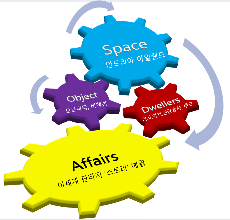 Space : '안드리아 아일랜드(Andria Island)'로 해봤습니다. 2천 미터 고도에 위치한 작은 왕국에서 아이디어를 발전시켰습니다. 하여, 떠다니는 '부유섬'으로 설계하는 것도 재밌을 것 같습니다.