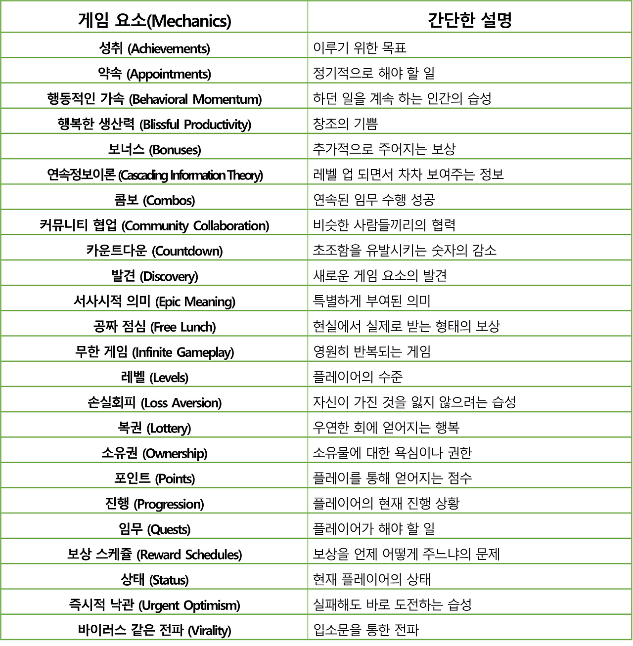 게임작품을 기획하는 창작자들은 익숙한 '게임요소'들일 수도 있습니다. 위의 24개 요소 외에 자신이 선호하는 메커닉스를 추가로 도입할 수도 있습니다.