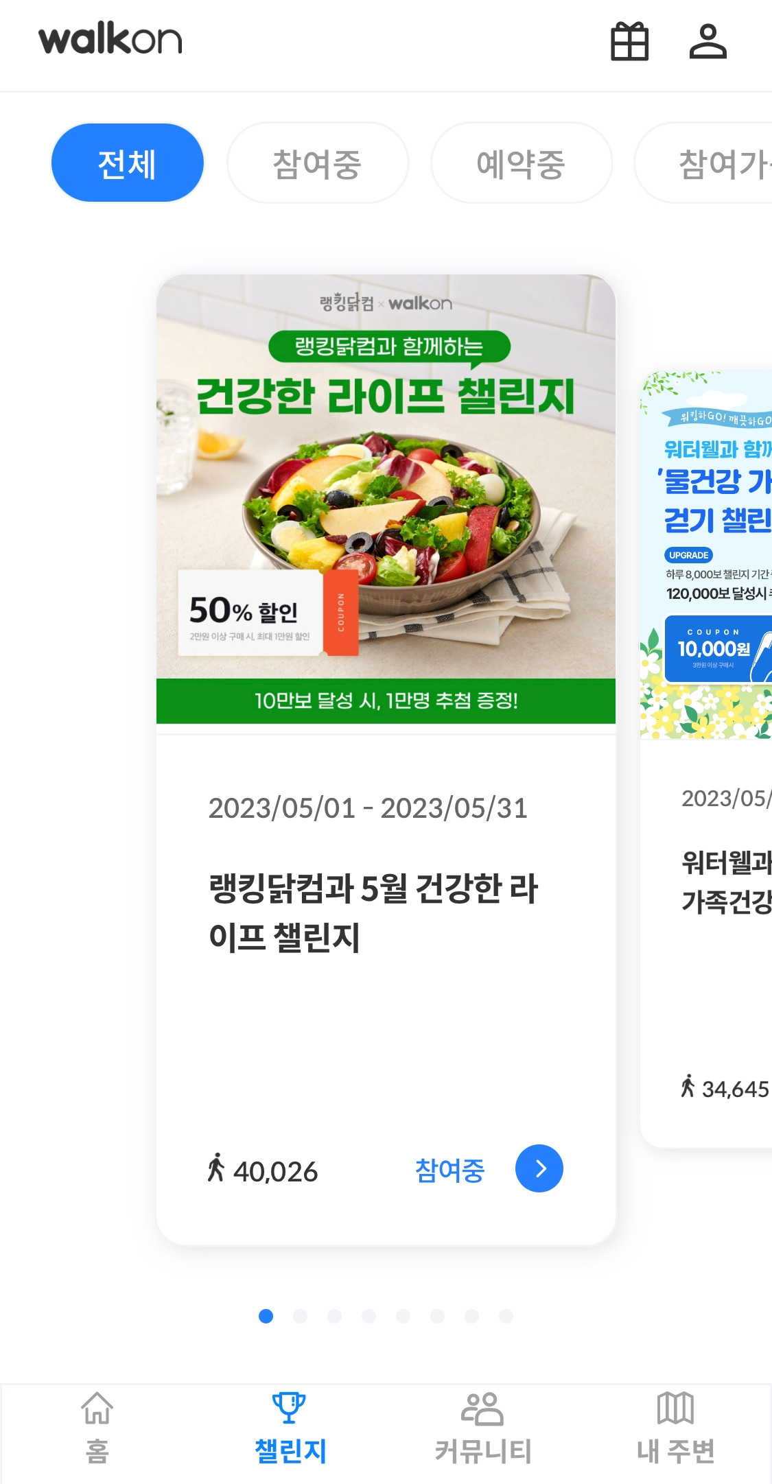 이런 것 말고도 캐시워크와 같은 각종 걸음 수를 기반으로 포인트나 쿠폰, 현금까지 적립해 주는 앱테크도 많아졌다. 최근에 알게 된 ‘워크온’이라는 어플도 있는데, 여러 챌린지에 참여해 일정 걸음 수를 넘기면 각종 쿠폰에 응모할 수 있었다.