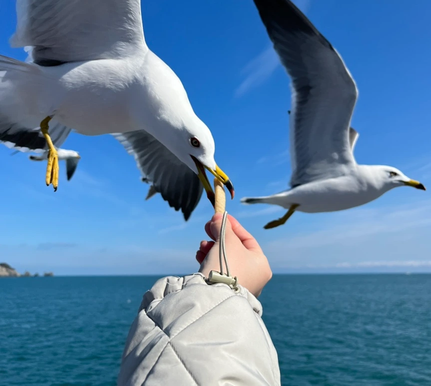 구름 한 점 없이 푸른 하늘에 하얀 갈매기 형님들, 거기에 따뜻한 바닷바람이 감돌았다. 여객선 밑으론 봄볕을 가득 머금은 깨끗한 바다가 있어, 이젠 정말 봄이 다가오고 있음을 느낄 수 있었다.