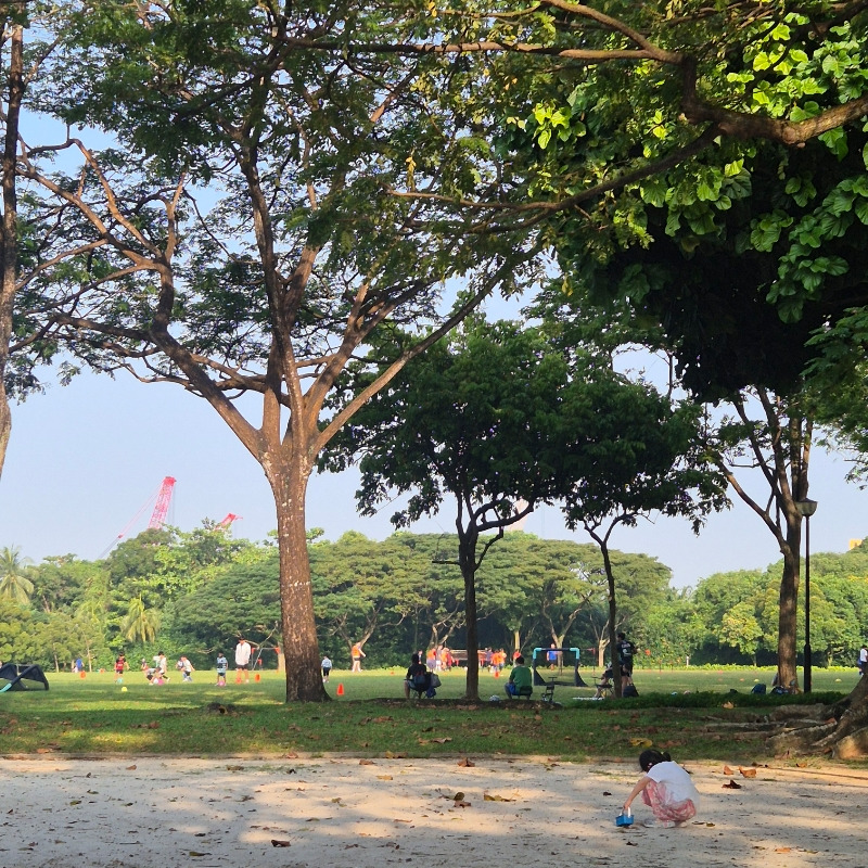 아직 서늘한 바람이 부는 아침 8시의 놀이터, 사람은 별로 없고, 어린이는 신이 나서 뛰어다닌다. 바나나를 하나 까먹은 후 모래로 디저트 가게를 만들어 엄마에게 계속 가져다준다.