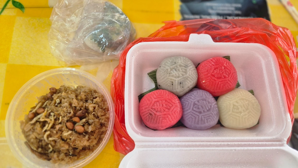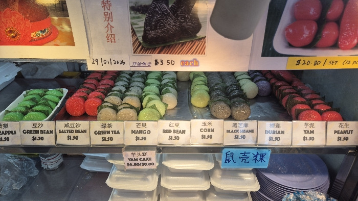 버스를 타고 호커센터로 간다. 길을 잘못 들어서 빙 둘렀는데 줄이 아주 긴 떡집이 있어서 가보니 맛집 바이브가 물씬 풍겨서 묻지도 따지지도 않고 줄을 섰다. Kueh라는 떡이었다. 뭘 먹을지 언니랑 막 고뇌하고 있는데 뒤에 계시던 아저씨가 웃으시면서 판매 베스트를 알려주셨다. 그래서 약밥이랑 떡을 샀다. 중국 전통 디저트인 것 같았는데 맛있었다. 딸이 고른 두리안 떡은 다 못 먹고 버렸고, 얌은 맛있다고 합니다.