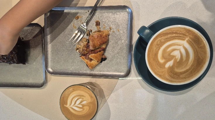 오토바이 가게 안에 있는 줄은 몰라서 좀 당황했지만, 언니와 나, 딸 이렇게 셋이 바 자리에 나란히 앉았다. 뭘 시킬까 하다가 버섯빵, 브라우니, 그리고 우리의 커피를 시켰다. 빵이 먼저 나왔는데 버섯빵이 이렇게 맛있을 일인가?? 입에서 녹아내리는 버섯맛은 처음 느껴보았다. 싱가포르 커피가 야쿤토스트 커피처럼 사약 같은 느낌인데(그 느낌도 좋음), 여기는 정말 한국 맛집 커피숍 느낌이어서 오랜만에 고국 생각이 나며 너무 좋았다. 그렇게 커피를 마시며 이야기를 하고 있는데 갑자기 “한국분이세요?” 하기에 “오옷!? “ 했는데 한국인은 아니시고 매우 한국말을 잘하는 싱가포르 분이셨다. 엄청나게 친절하신 데다가 ”원래 저희가 어린이 손님이 오면 베이비치노를 서비스로 드려요. 따뜻한 우유에 거품 올린 거요~ 한잔 드릴까요? “라고 나보다 한국말을 더 잘하신다. 그래서 감사하게 한 잔 받았다. 어떻게 한국말을 이렇게 잘할 수 있지? 물론 커피도 너무 맛있었고 신기방기했음.