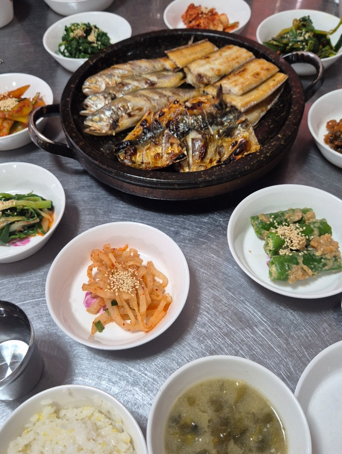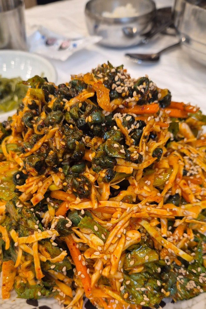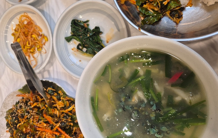 내려와서 밥을 먹었다. 남도의 맛이란... 모든 반찬이 다 맛있다. 파무침, 노각, 어묵조림, 수제비는 말할 것도 없고, 다슬기 무침은 쫄면이 생각나는 쫄쫄한 맛이었다. 다슬기 쫄면이 있다면 먹어보고 싶다고 생각하며 다방커피를 뽑아 나온다.